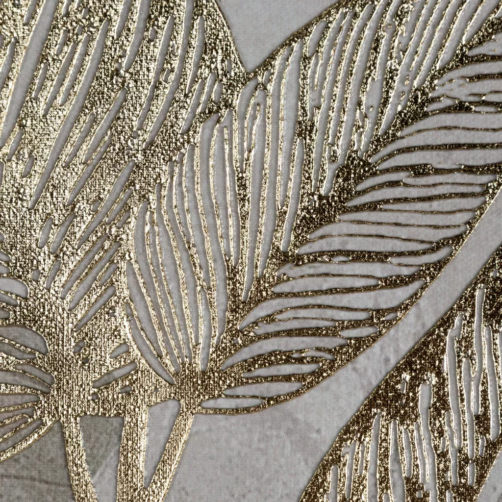 Kifinomult, természet ihlette falikép arany levélmotívumokkal, szürke tónusú háttéren.