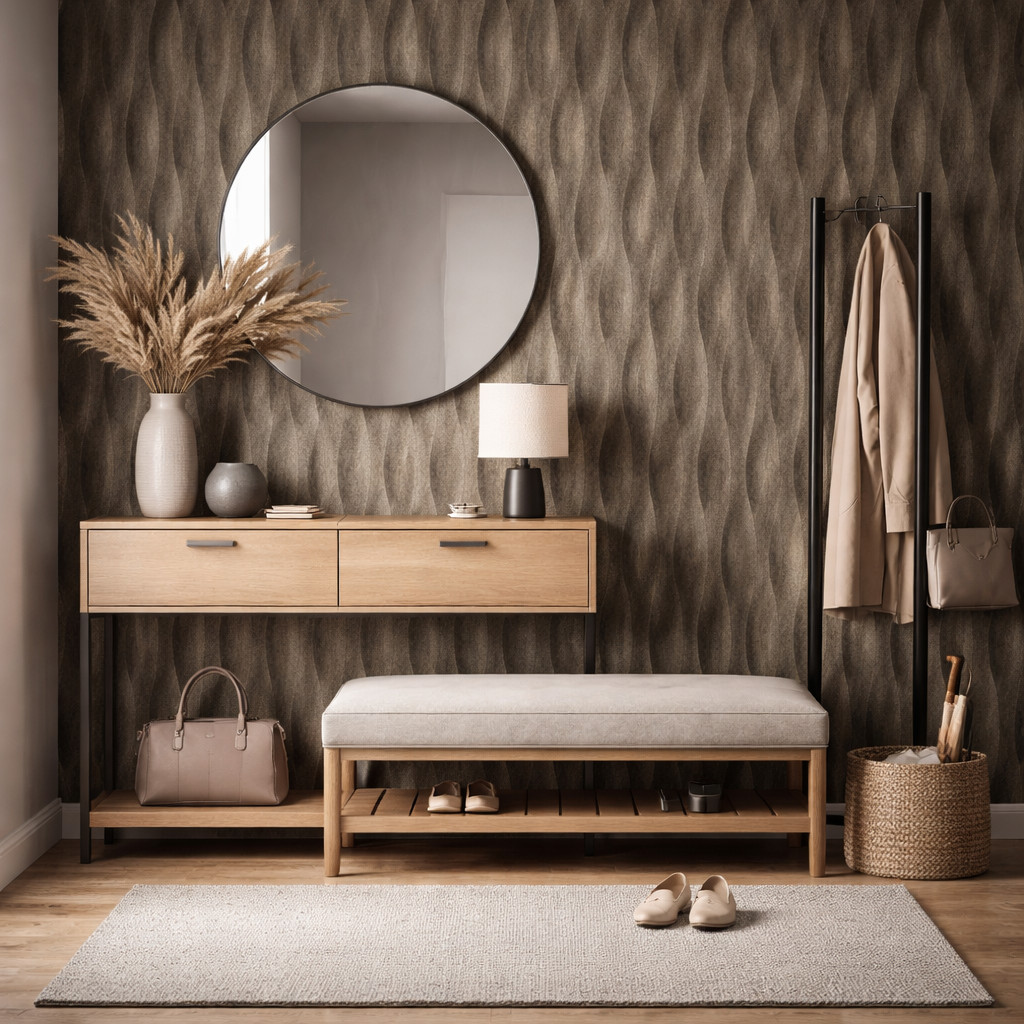 Elegáns barna árnyalatú, hullámmintás tapéta finoman strukturált felülettel. Modern és letisztult enteriőrök tökéletes választása, ahol a textúra és a visszafogott design kerül fókuszba.