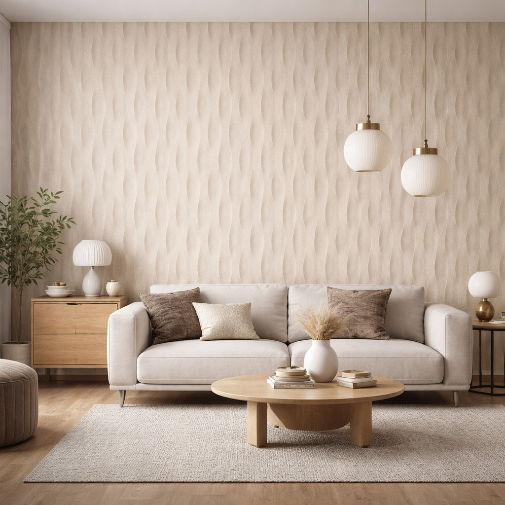 Elegáns beige árnyalatú, hullámmintás tapéta finoman strukturált felülettel. Modern és letisztult enteriőrök tökéletes választása, ahol a textúra és a visszafogott design kerül fókuszba.