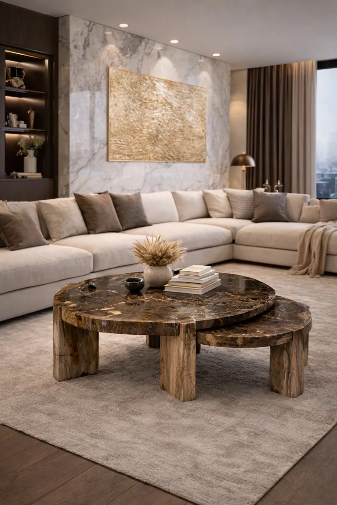 Excusive design asztal megkövesedett fából készült asztallappal valódi statement darab a modern és természetközeli enteriőrökben. Az asztalok egyedi mintázatú, kőhatású felülete a természet erejét és időtállóságát tükrözi, miközben prémium, exkluzív megjelenést biztosít. A masszív kialakítás stabil használatot garantál, a két különböző méretű asztal pedig rugalmasan variálható a térben – együtt vagy külön-külön is látványosak. Ideális választás nappaliba, lounge térbe vagy exkluzív lakásdekorációként.