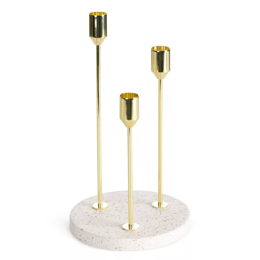 Elegáns arany színű 3-as gyertyatartó fehér márvány talppal 15X26cm