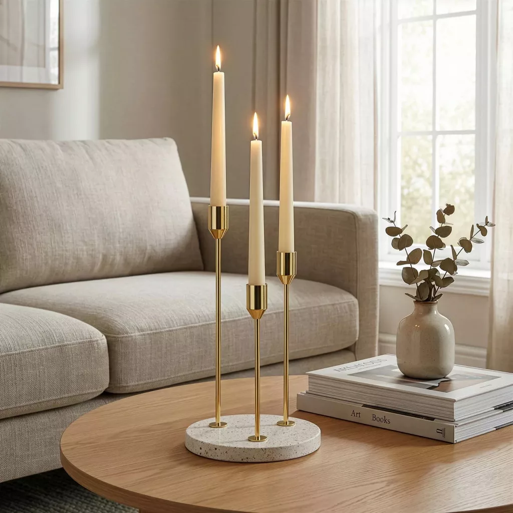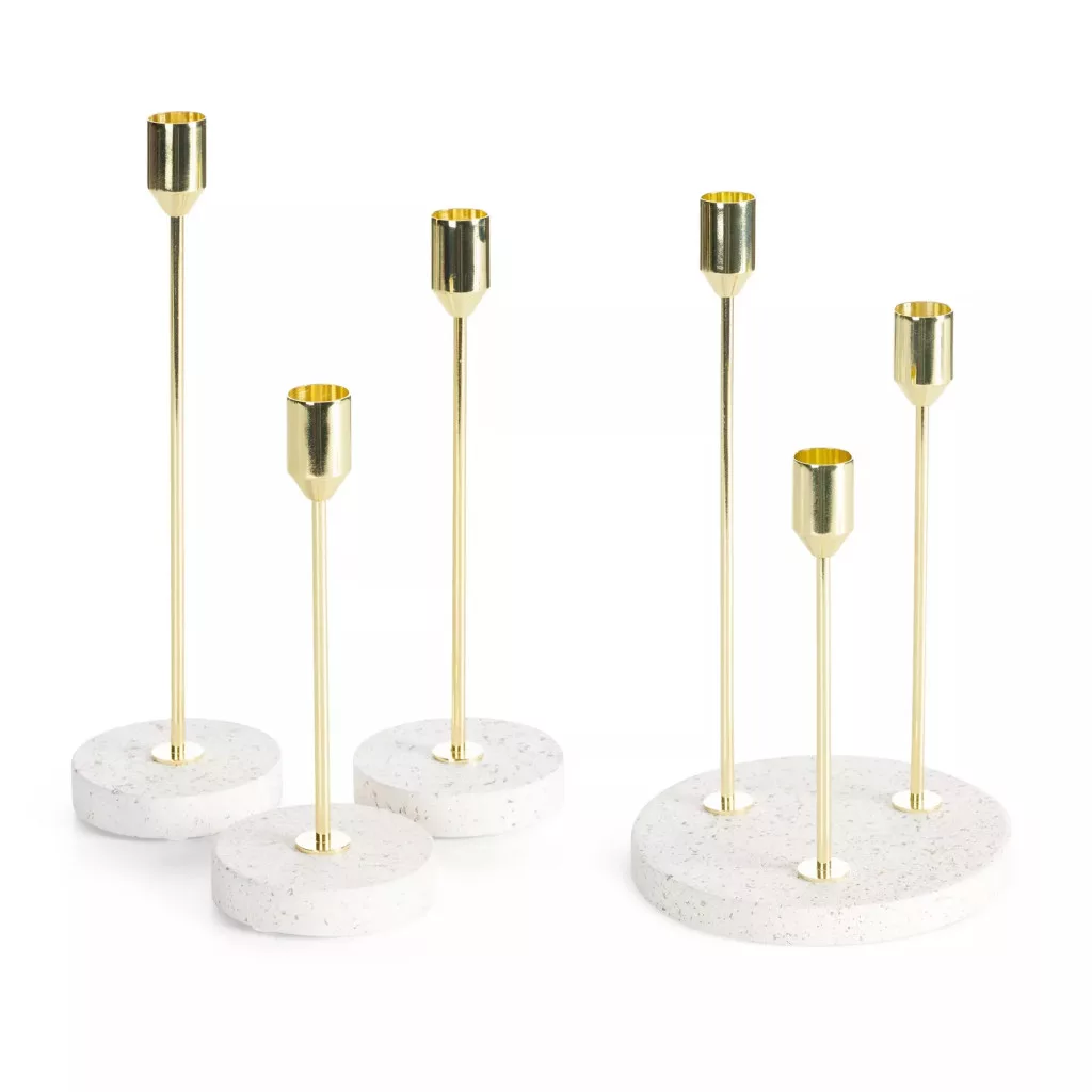Ez a prémium megjelenésű gyertyatartó a modern elegancia tökéletes megtestesítője. A karcsú, arany színű fém szár és a márványhatású, világos talp időtálló luxus érzetet ad a térnek.