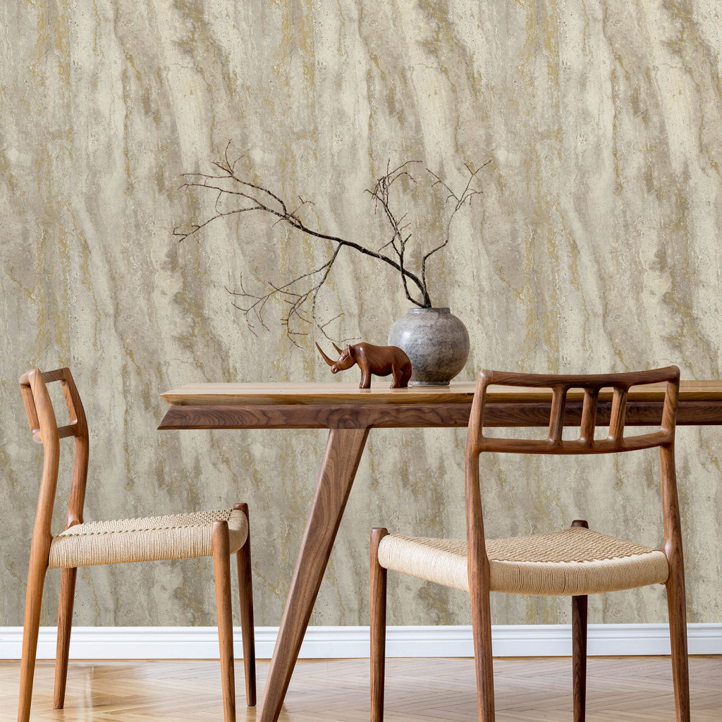 Elegáns travertin kőhatású tapéta természetes erezett mintázattal. Tökéletes választás nappaliba, étkezőbe, előszobába vagy modern, japandi enteriőrökbe.
