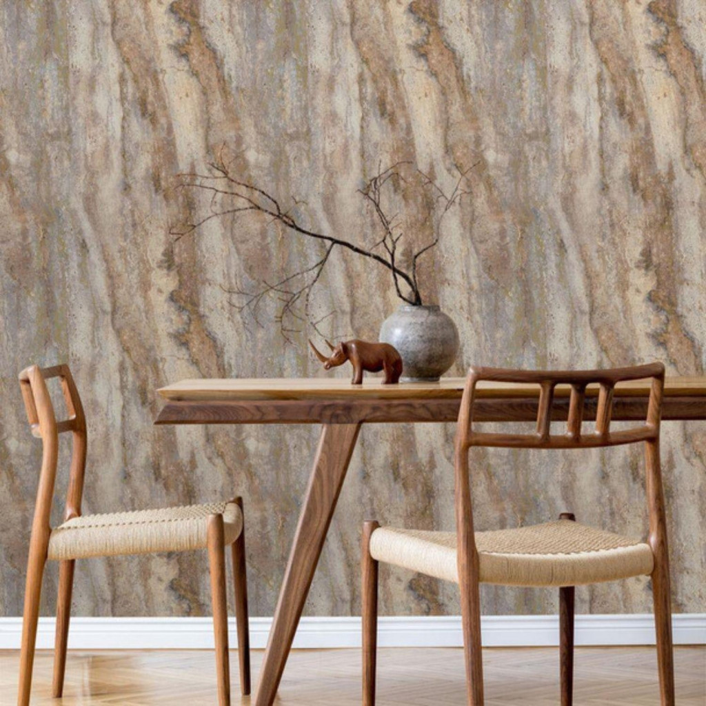 Elegáns travertin kőhatású tapéta természetes erezett mintázattal. Tökéletes választás nappaliba, étkezőbe, előszobába vagy modern, japandi enteriőrökbe.