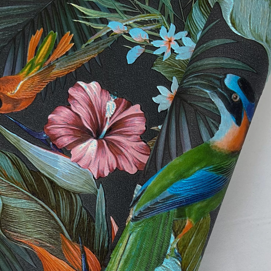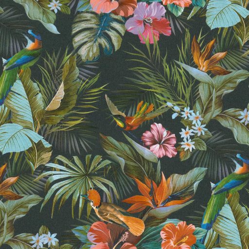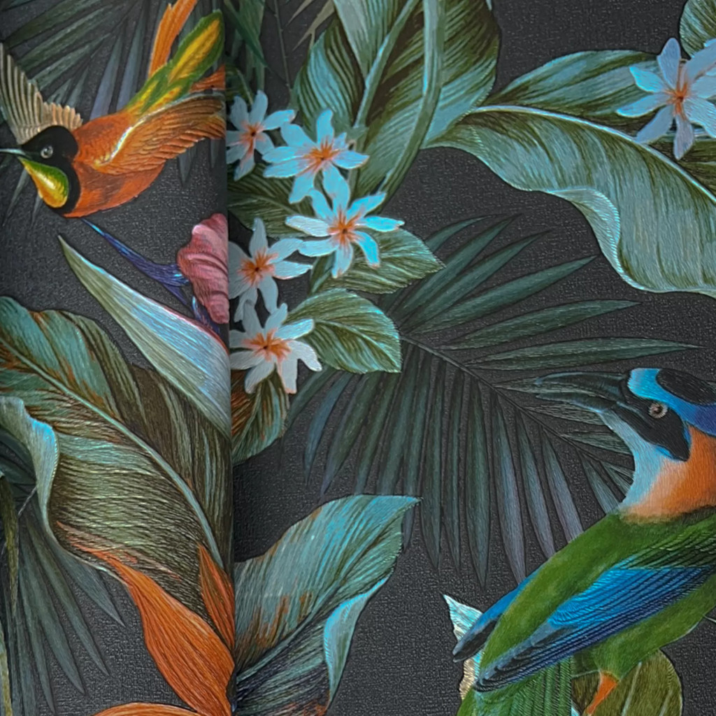 Ez a különleges, trópusi hangulatú tapéta azonnal luxus és karakteres megjelenést kölcsönöz bármely enteriőrnek. A mély, sötét háttéren megjelenő élénk színű egzotikus madarak, pálmalevelek és virágmotívumok elegáns kontrasztot alkotnak, így a fal valódi fókuszponttá válik.