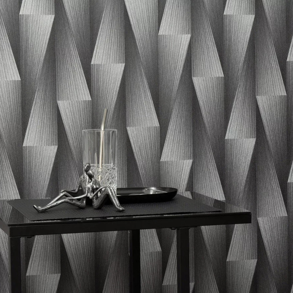 A geometrikus 3D mintázat optikailag mélységet ad a falnak, így fókuszpontként is megállja a helyét. Sötétebb bútorokkal, fekete kiegészítőkkel és meleg fényekkel különösen exkluzív összhatást érhetsz el.