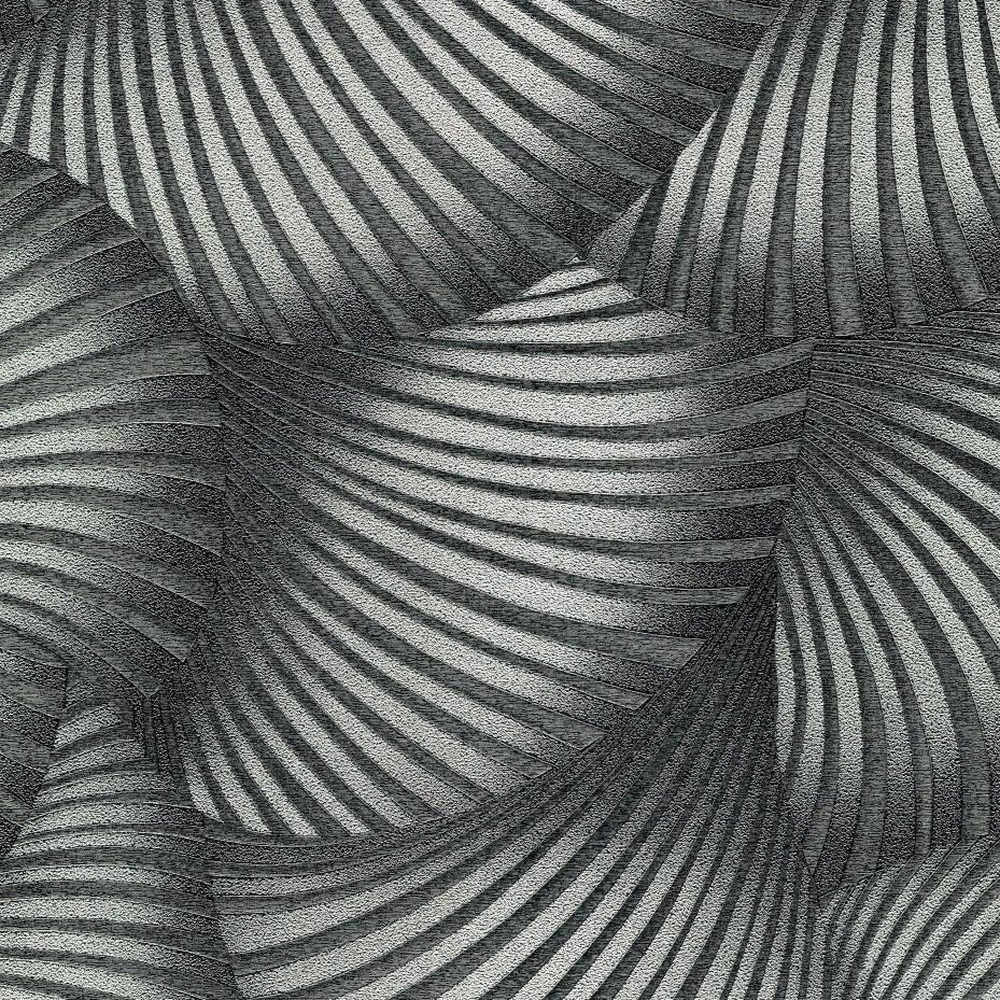 Látványos fekete–ezüst mintás tapéta dinamikus, hullámzó art deco stílusban. Luxus hatású faldekor nappaliba, hálóba vagy modern enteriőrbe