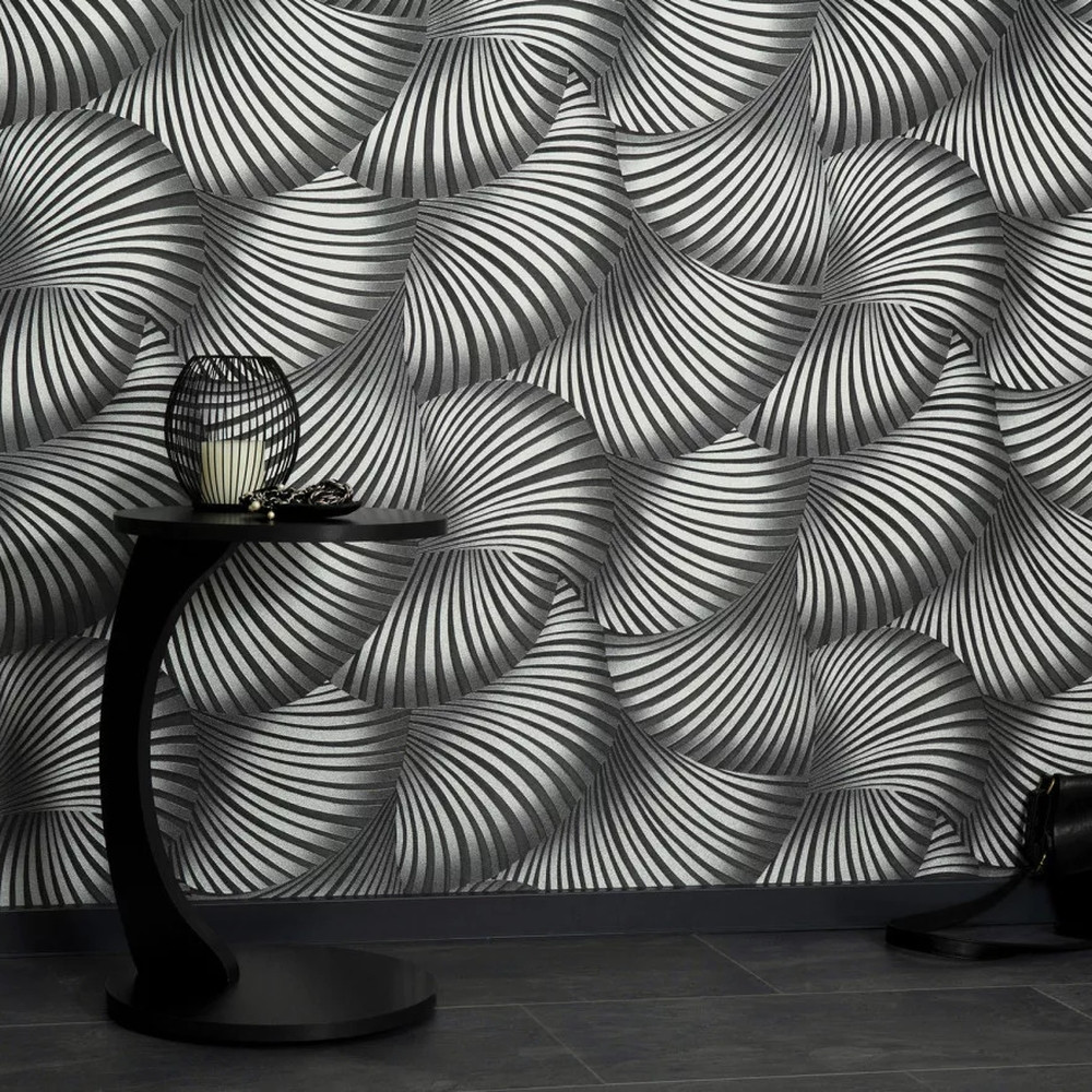 Ez a különleges fekete-ezüst mintás tapéta modern, mégis elegáns megjelenést kölcsönöz a térnek. A dinamikusan örvénylő, art deco ihletésű minta mélységet és luxus érzetet teremt, miközben a fekete és ezüst színek harmonikus kombinációja exkluzív hangulatot biztosít.