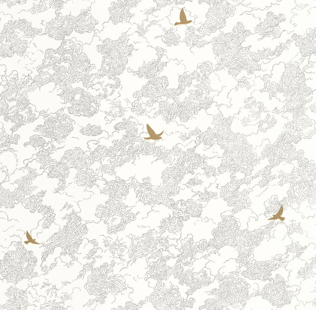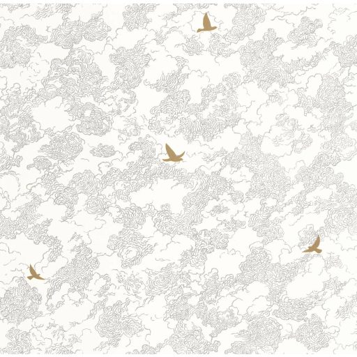 Elegáns felhő mintás tapéta finom rajzolatú felhőkkel és arany madár motívumokkal. Modern és stílusos faldekoráció nappaliba vagy hálószobába.