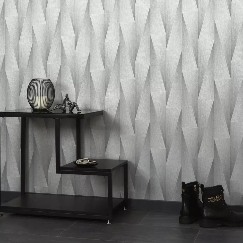 A geometrikus 3D mintázat optikailag mélységet ad a falnak, így fókuszpontként is megállja a helyét. Sötétebb bútorokkal, fekete kiegészítőkkel és meleg fényekkel különösen exkluzív összhatást érhetsz el.