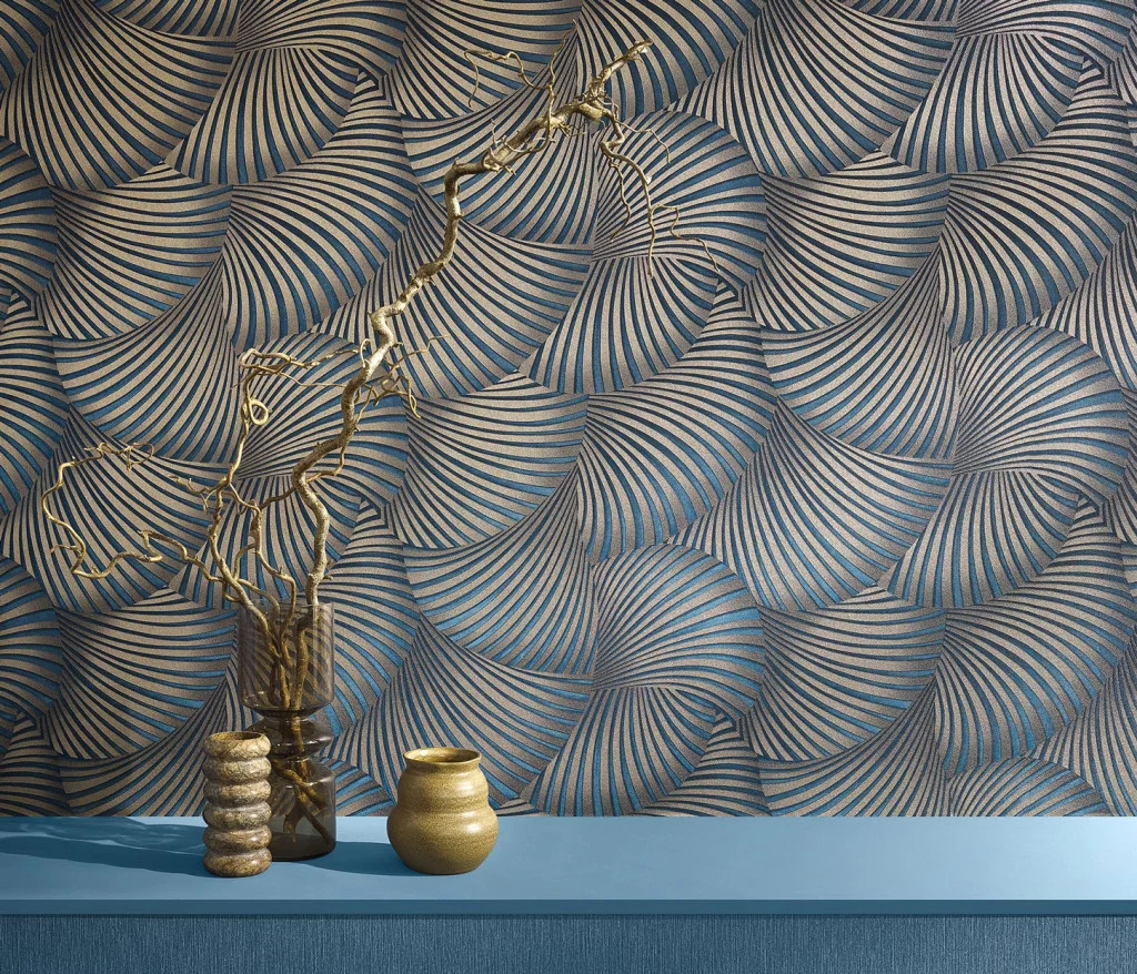 Látványos kék–arany mintás tapéta dinamikus, hullámzó art deco stílusban. Luxus hatású faldekor nappaliba, hálóba vagy modern enteriőrbe