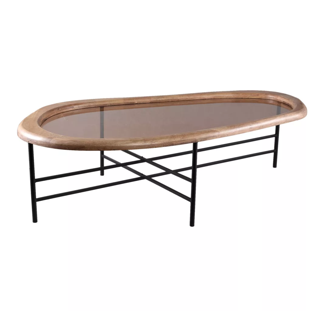 Elegáns kerek dohányzóasztal fa peremmel és üveglappal, fekete fém vázzal. A természetes anyaghasználat és a letisztult forma harmonikusan illeszkedik modern, loft vagy prémium enteriőrökbe. Ideális választás nappaliba, kanapé elé vagy ülőgarnitúra mellé.