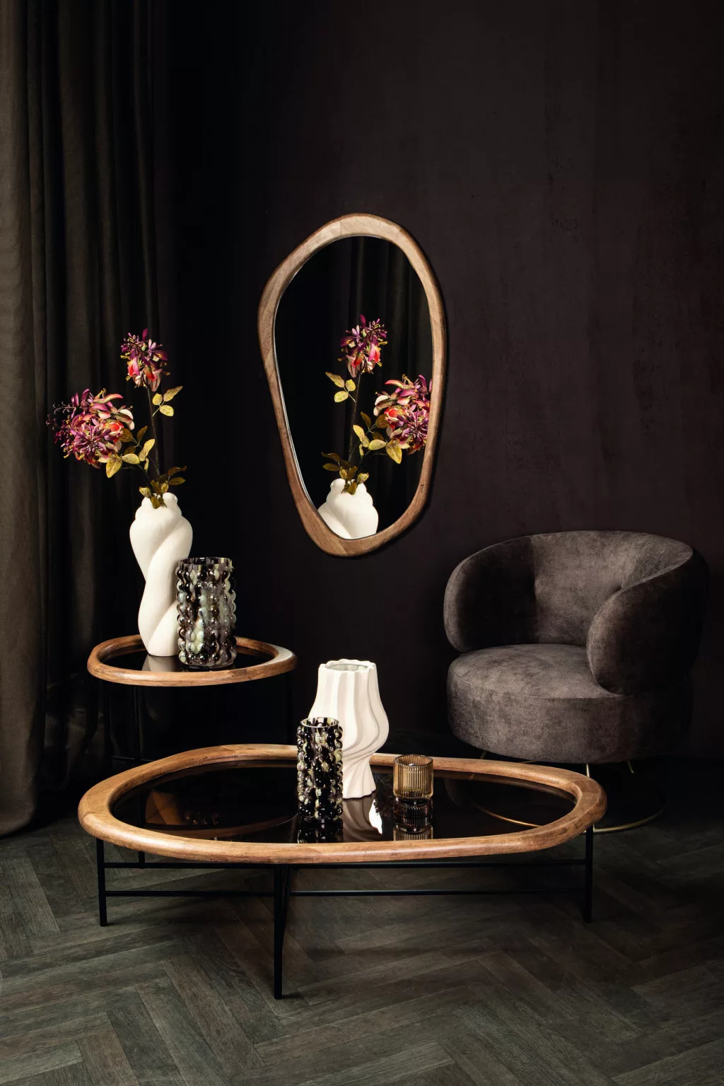 Ez a kerek dohányzóasztal természetes fa peremével és füstös üveglapjával meleg, mégis modern megjelenést ad a nappalinak.