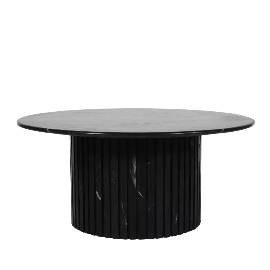 Ez a kerek dohányzóasztal fekete márvány asztallapjával és bordázott, hengeres talpával elegáns és karakteres megjelenést ad a nappalinak. Letisztult forma, erőteljes design.