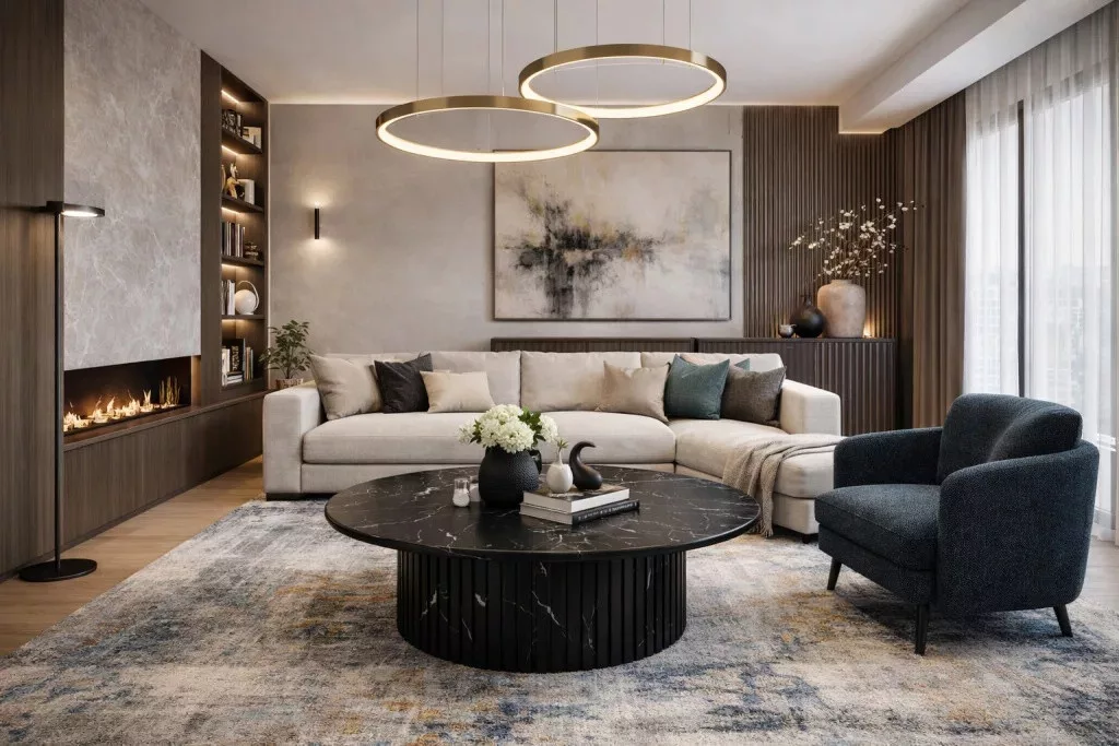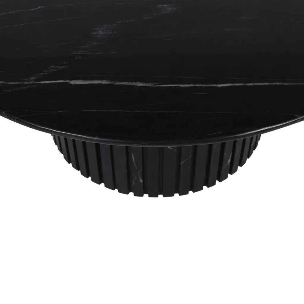Prémium kerek dohányzóasztal fekete márvány lappal és bordázott talpkialakítással. Modern, elegáns design, amely tökéletesen illeszkedik luxus, minimalista vagy kortárs enteriőrökbe. Ideális központi bútordarab nappaliba vagy kanapé elé.