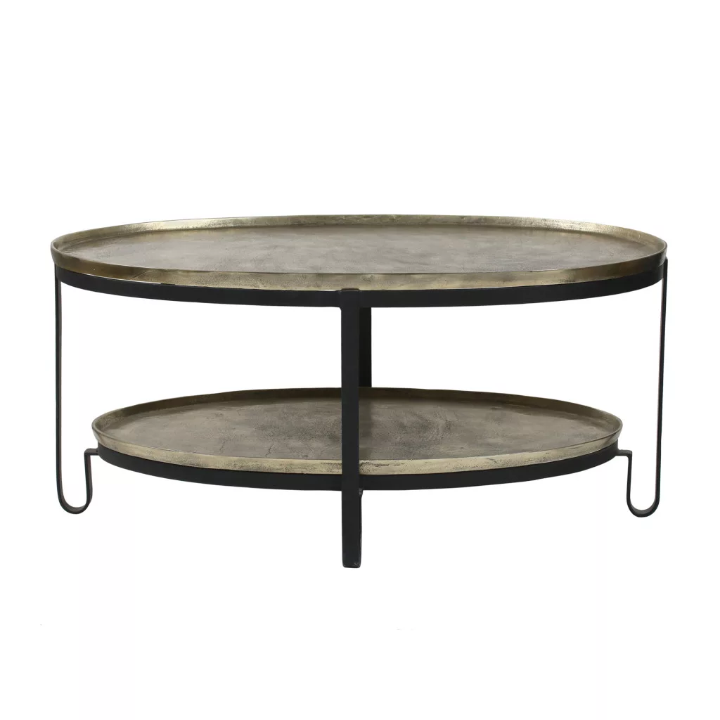 Stílusos kerek dohányzóasztal antik arany színű fém tálcákkal és stabil fekete vázzal. Kétszintes kialakítása praktikus tárolást kínál, miközben modern és elegáns megjelenést ad a nappalinak. Ideális választás modern, loft vagy industrial enteriőrbe.