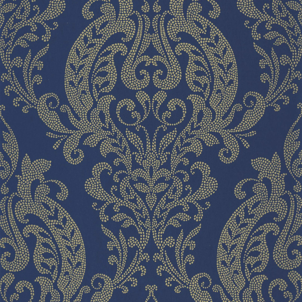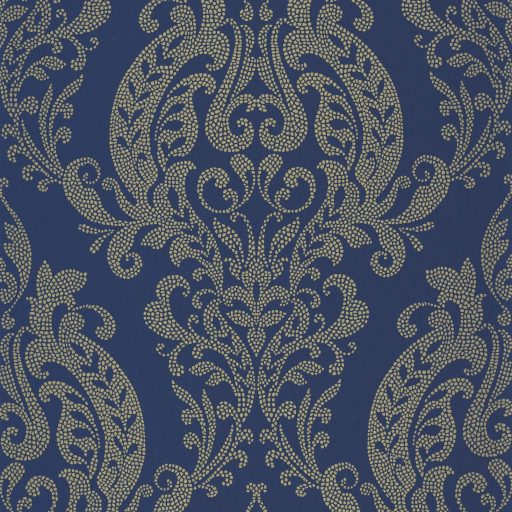 Kék alapon arany tónusú, részletgazdag damaszt mintás tapéta, amely kifinomult és luxus hangulatot