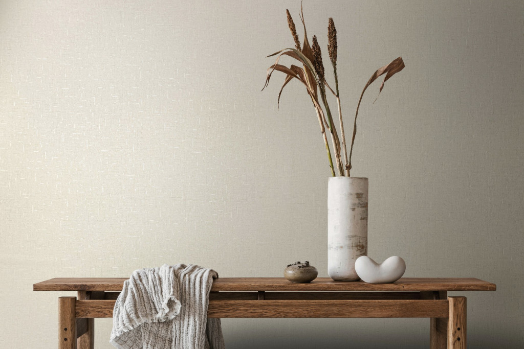 Világos krém árnyalatú, finom szövetszerkezetet idéző tapéta textilhatású felülettel. Letisztult, elegáns választás modern és klasszikus enteriőrökhöz.