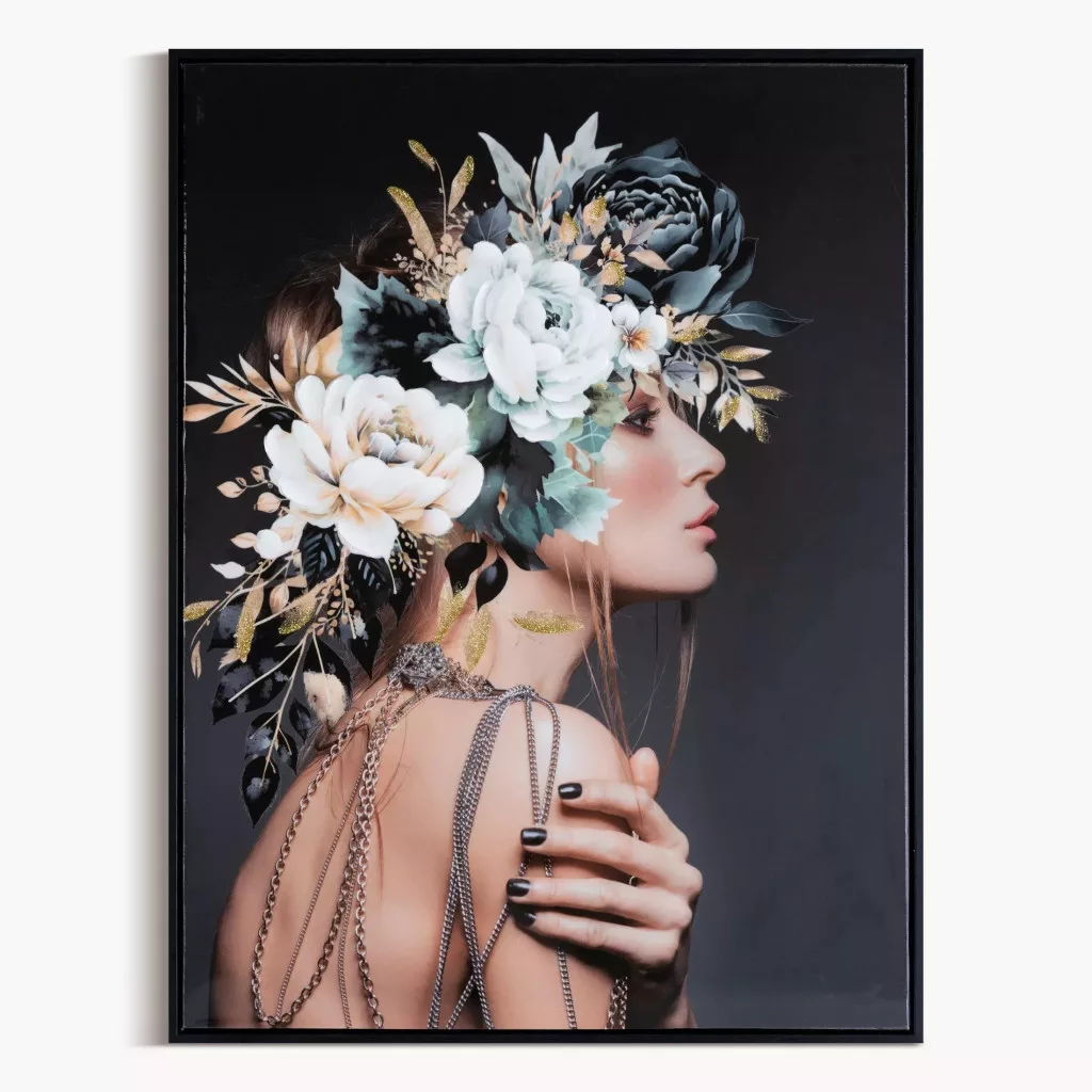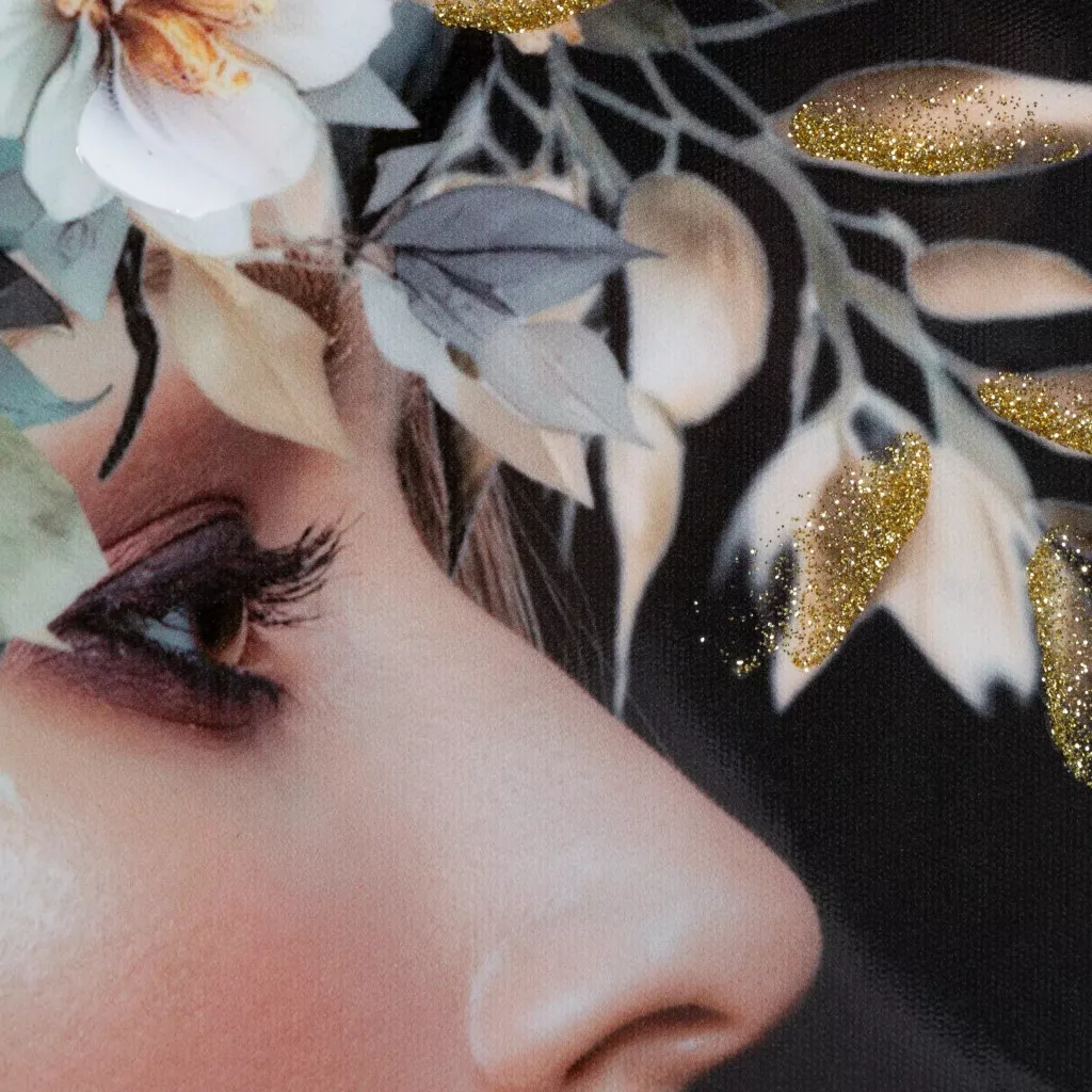 Ez a lenyűgöző női portré vászonkép a modern művészet és a kifinomult glamour stílus találkozása. A virágkoronás kompozíció romantikus és luxus hangulatot teremt.