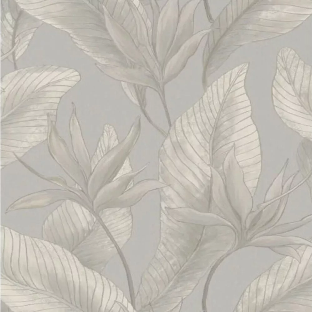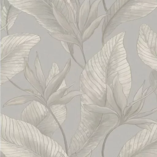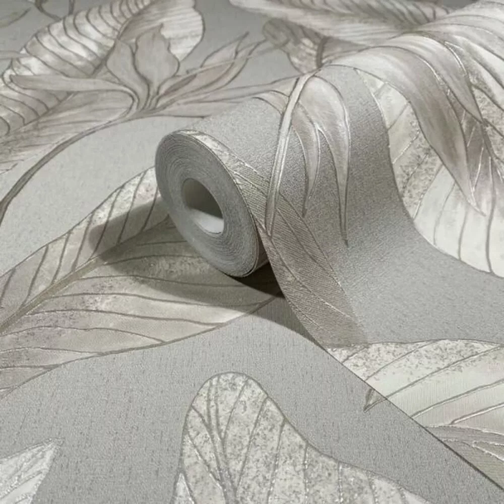 Letisztult, nagy levélmintás tapéta finom textúrával beige, szürke kombinációval