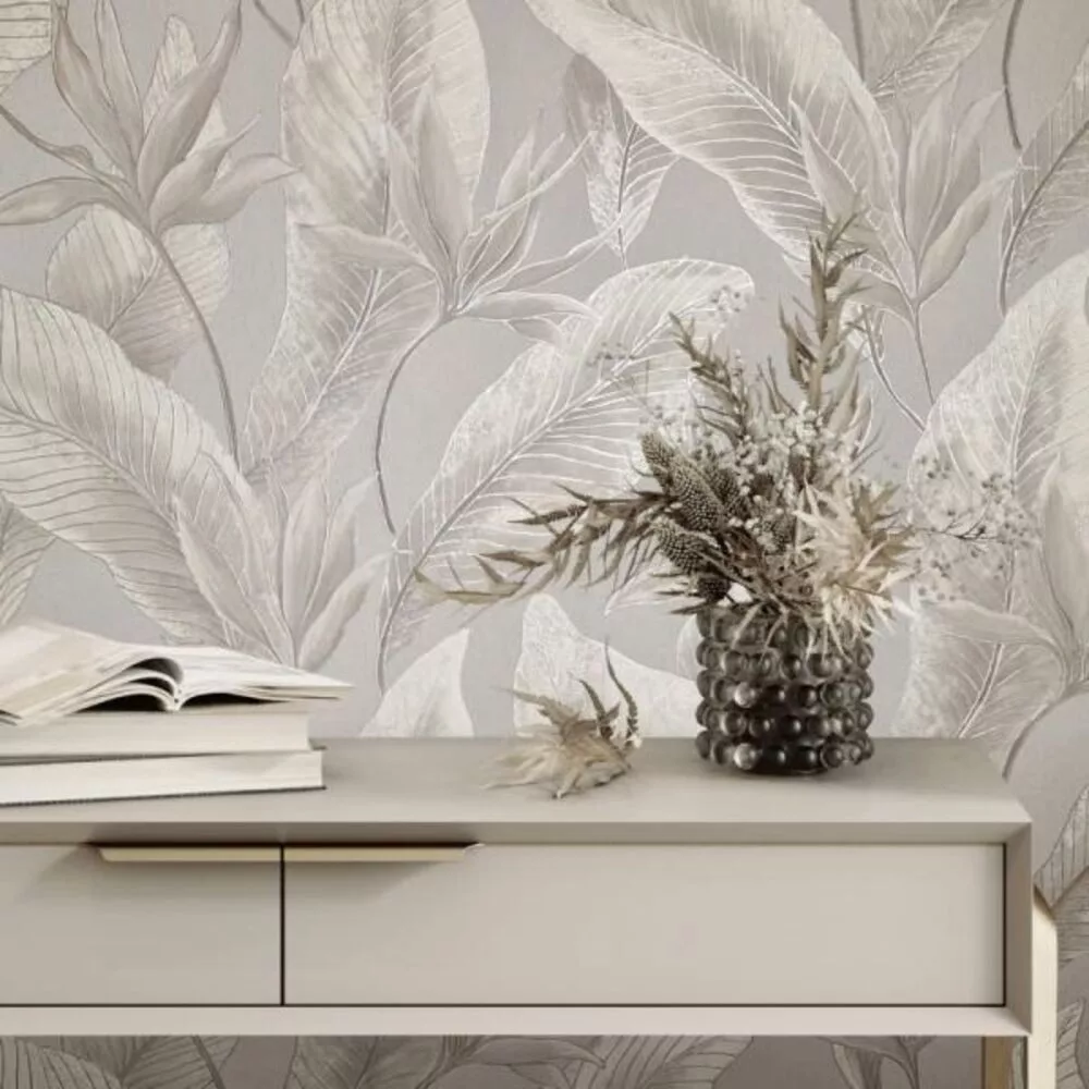 Letisztult, nagy levélmintás tapéta finom textúrával, amely modern és elegáns hangulatot teremt. Tökéletes választás nappaliba, hálószobába vagy exkluzív enteriőrbe.