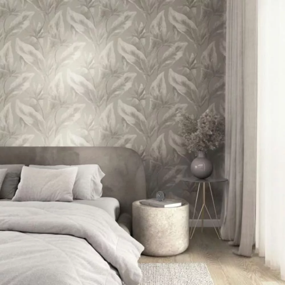 A tapéta különlegessége a lágy, textil hatású háttér és a részletgazdag, grafikus levélminták kombinációja, amely térérzetet és mélységet ad a falnak. Ezáltal a helyiség nemcsak stílusosabb, hanem vizuálisan tágasabb és világosabb hatású lesz.