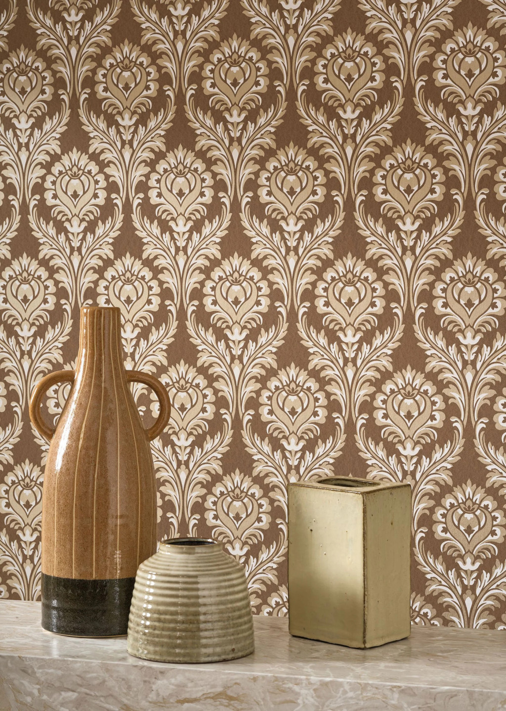 A részletgazdag, szimmetrikus damaszt minta időtálló stílust képvisel, miközben barna színkombináció meleg, luxus hangulatot teremt. Ideális választás hálószobába, nappaliba vagy elegáns étkezőbe, ahol a fal dekorációja hangsúlyos design elem.