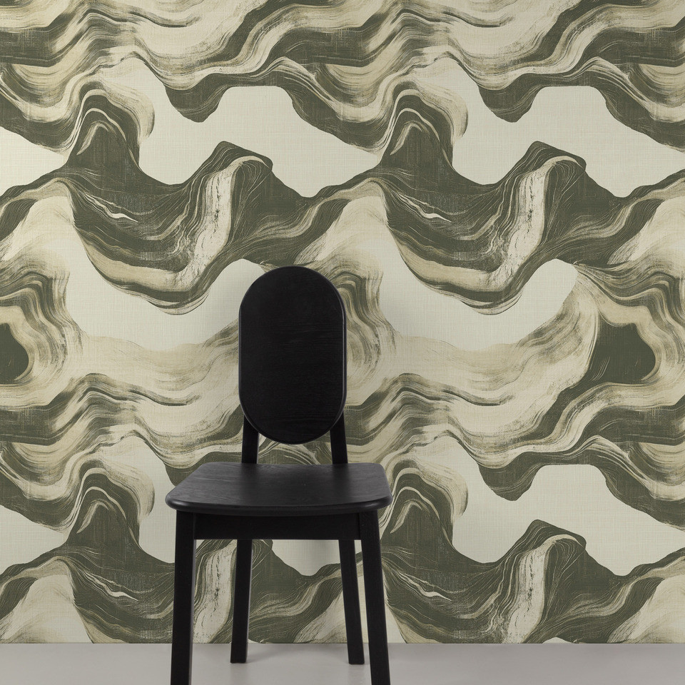Modern absztrakt hullámmintás tapéta krém alapon  zöld tónussal, textilhatású felülettel