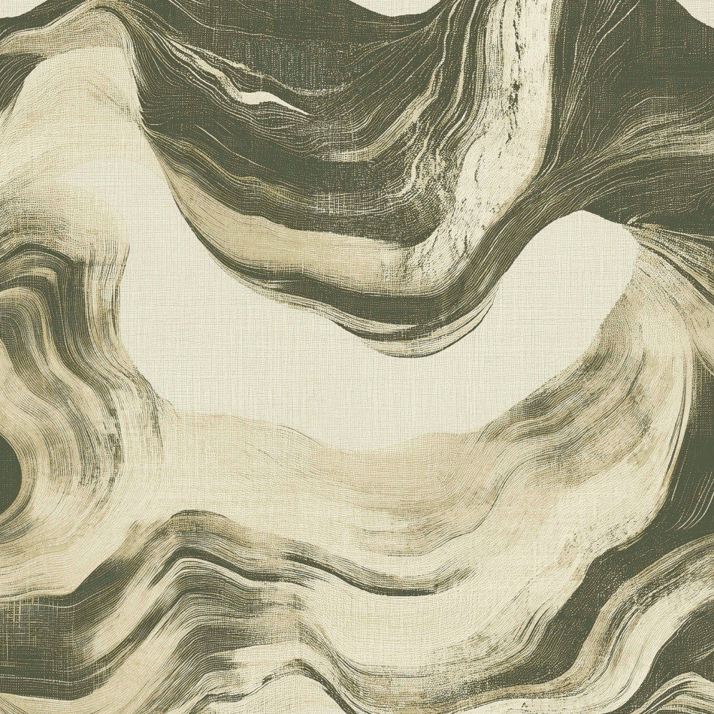 Modern absztrakt hullámmintás tapéta fekete és bézs árnyalatokkal, textilhatású felülettel. Exkluzív designer faldekor nappaliba, hálószobába vagy elegáns enteriőrökbe.