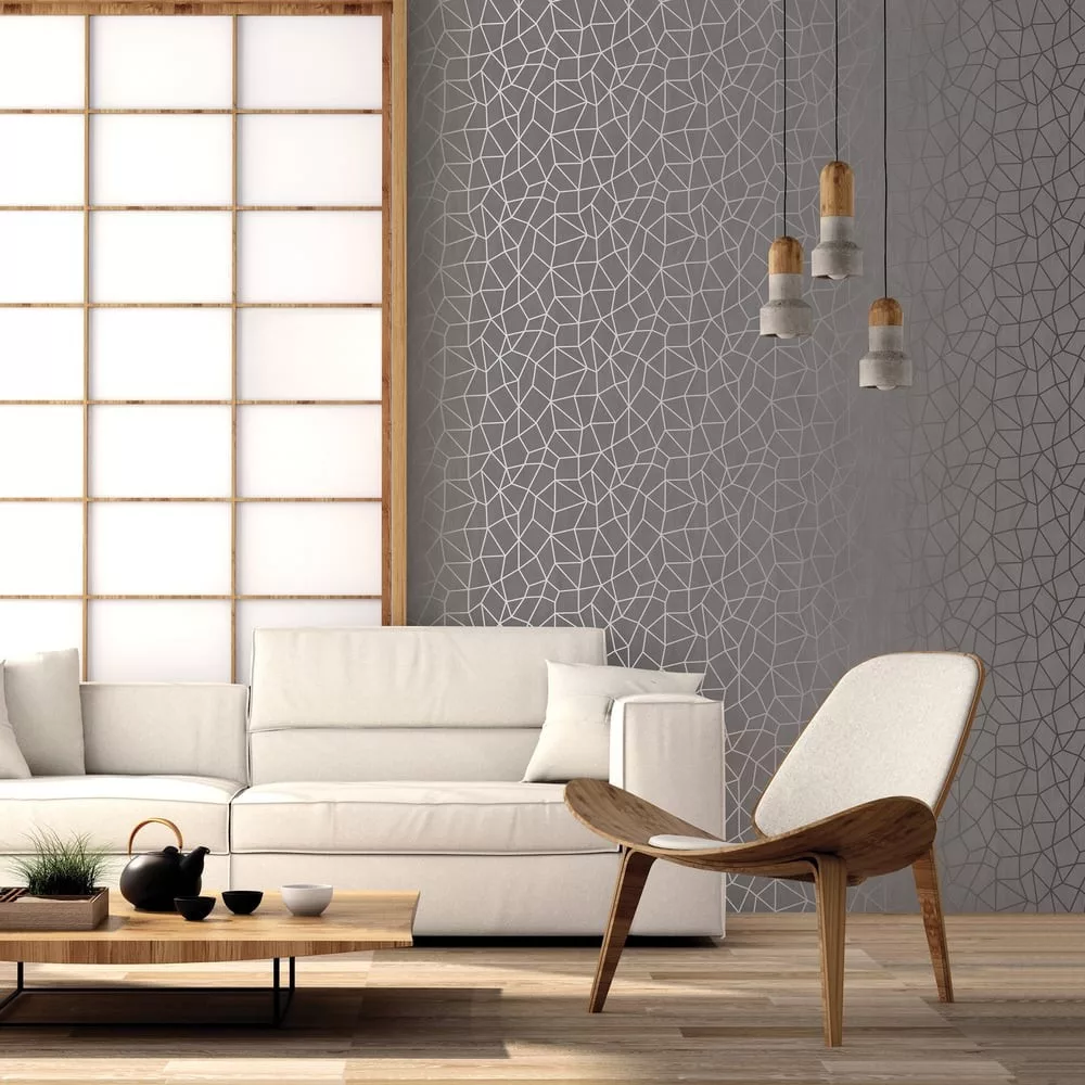 Modern, letisztult geometrikus mintás tapéta finom vonalháló mintával  szürkésbarna-ezüst fémes csillogásal