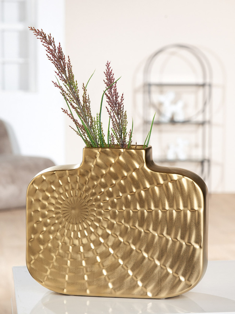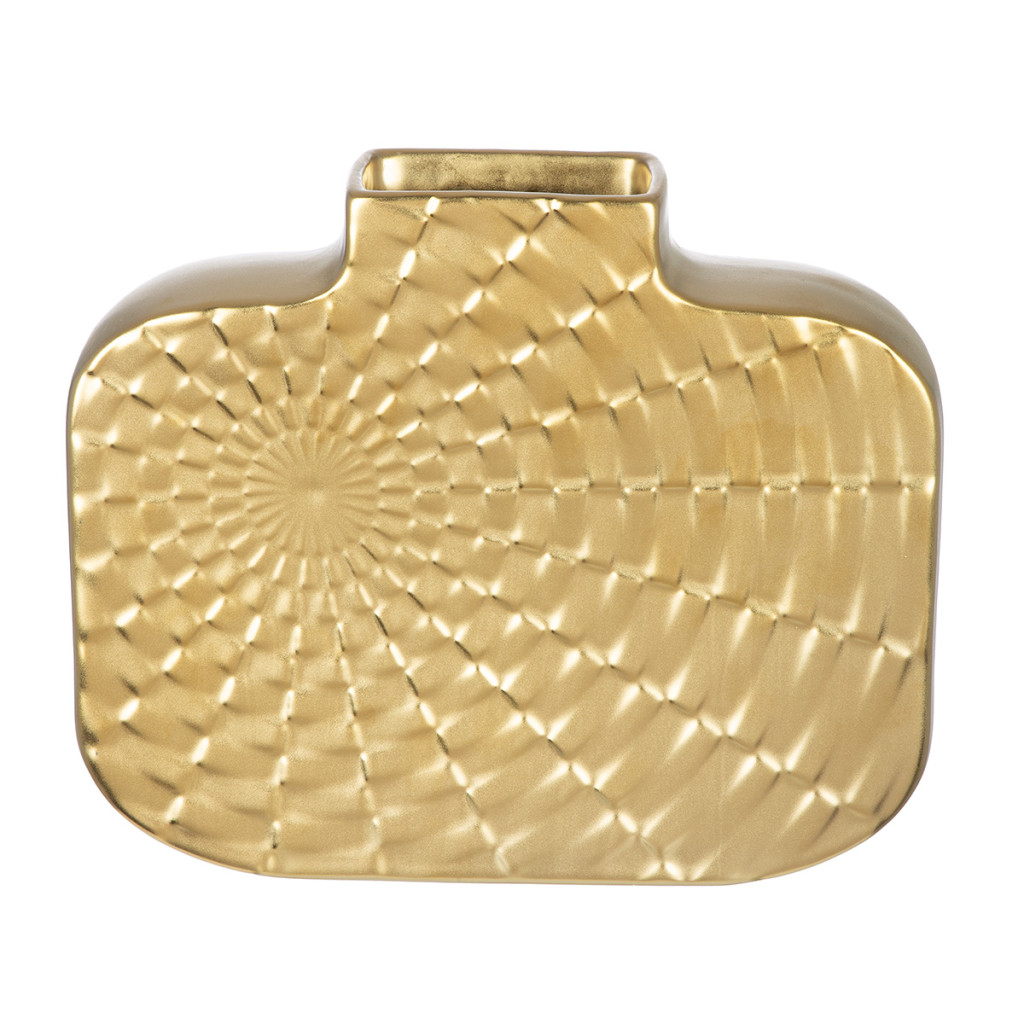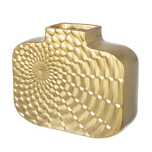 Modern, arany színű kerámia dekorváza különleges, radiális geometrikus mintázattal. Elegáns kiegészítő nappaliba, komódra, konzolasztalra vagy polcra, műnövénnyel és önálló dekorációként is tökéletes választás.