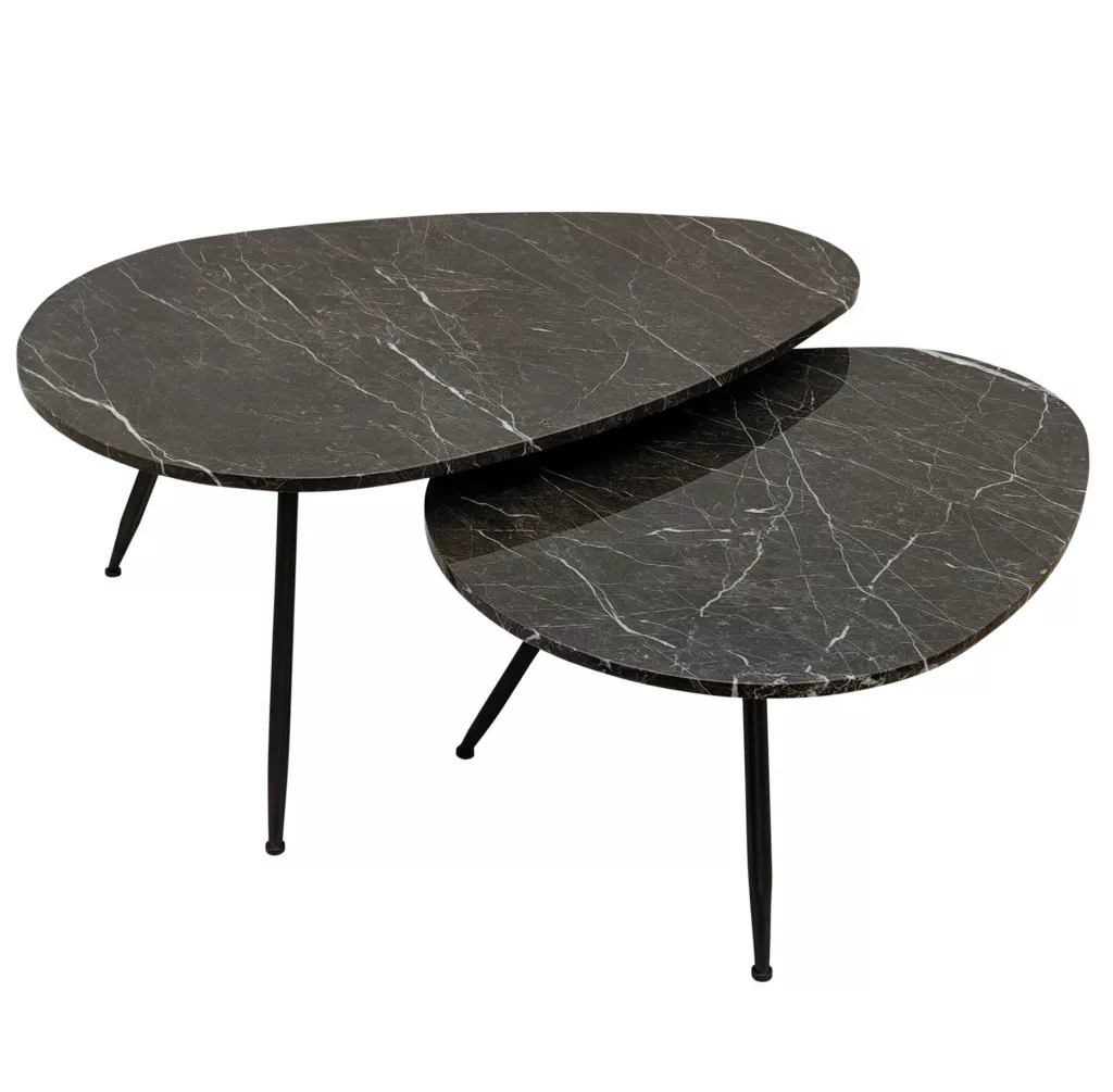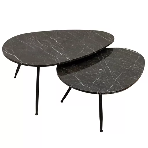 Ez a két darabos ovális dohányzóasztal szett elegáns márvány tetővel és karcsú, fekete fém lábakkal készült. Az egymásba tolható kialakítás praktikus, mégis látványos megoldást kínál modern nappalikba.