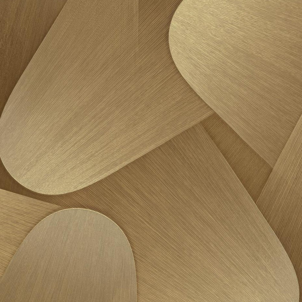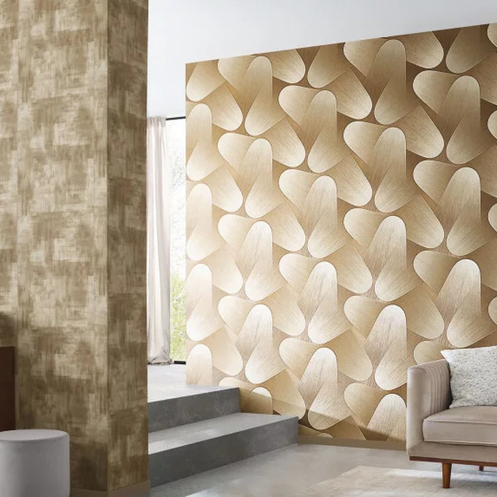 2026 -os trend tapéta arany és barna árnyalatú, térhatású geometrikus mintájával luxus és karakteres megjelenést ad a térnek. Ideális modern, elegáns nappalik és design enteriőrök főfalára.