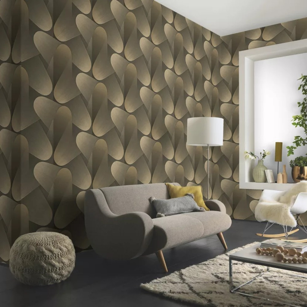 2026 -os trend tapéta arany és barna árnyalatú, térhatású geometrikus mintájával luxus és karakteres megjelenést ad a térnek. Ideális modern, elegáns nappalik és design enteriőrök főfalára.