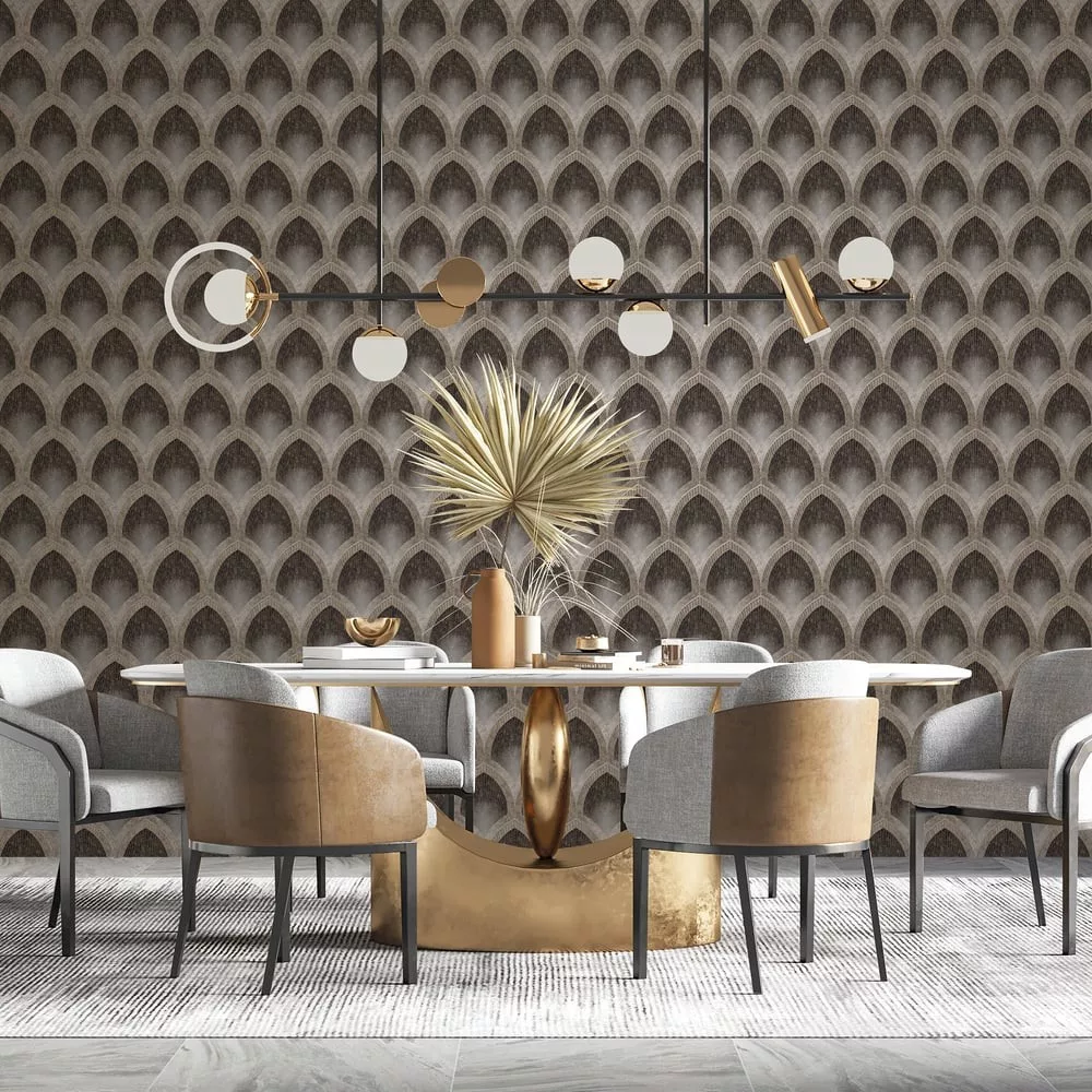 Exkluzív megjelenésű, art deco stílusú tapéta elegáns íves geometrikus mintázattal. Tökéletes választás nappaliba, étkezőbe vagy hálószobába, ahol prémium és luxus enteriőr hangulat kialakítása a cél.