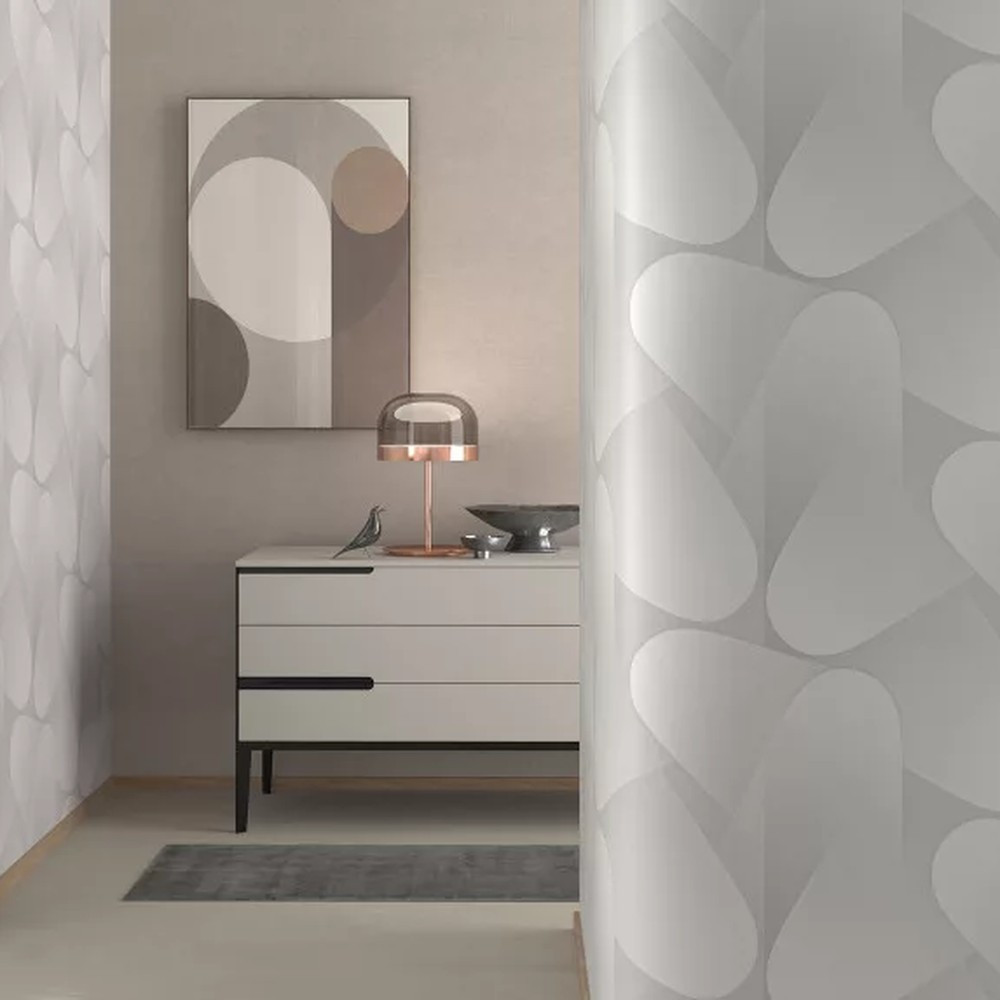 Ez a prémium design tapéta különleges, egymásba fonódó, lekerekített geometrikus formáival dinamikus, mégis kifinomult vizuális élményt nyújt.
