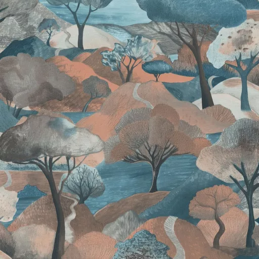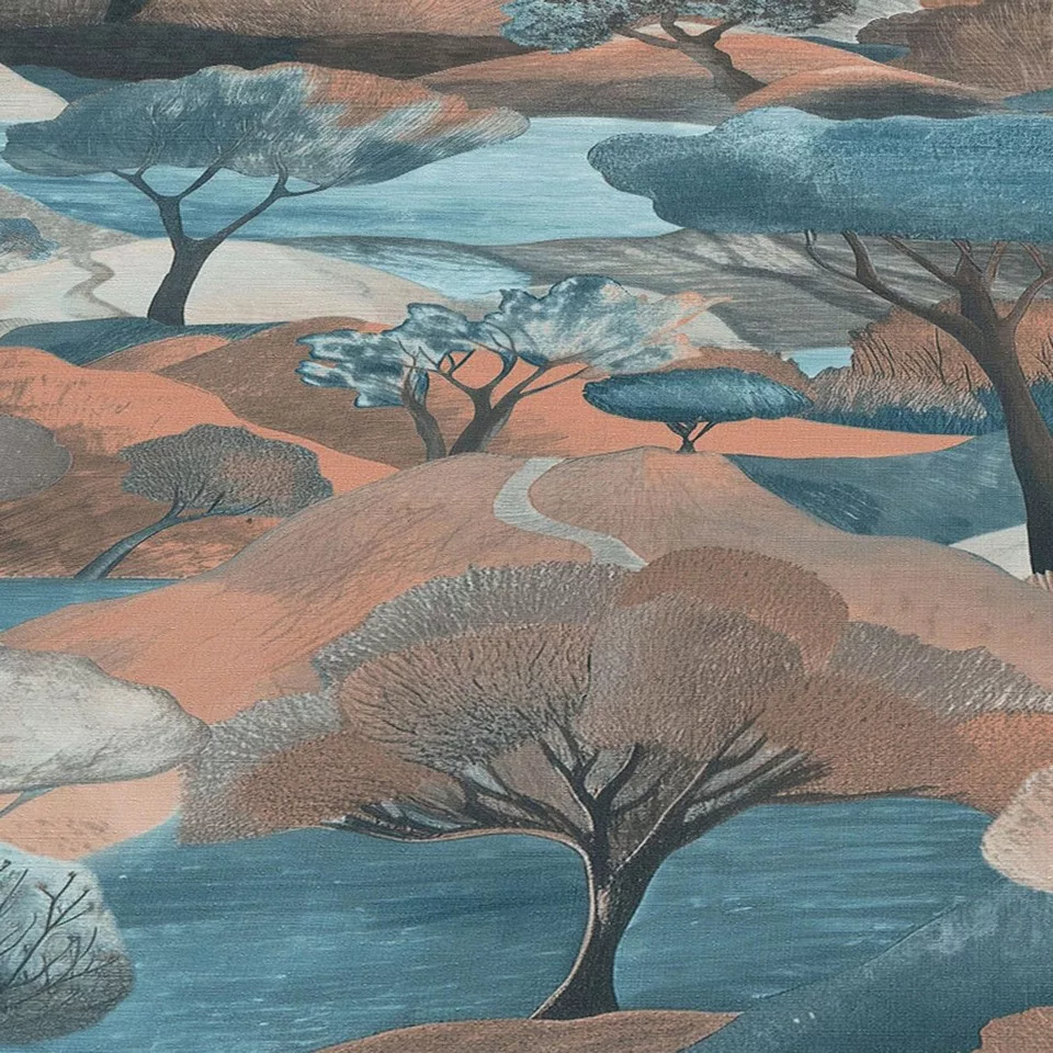 Ez a dekor tapéta egy stilizált, festői tájvilágot jelenít meg, amely egyedi karaktert ad a térnek. A részletgazdag kompozíció és a finoman rétegzett formák különleges mélységet hoznak létre, így a fal nemcsak háttérként, hanem látványos fókuszpontként is működik.