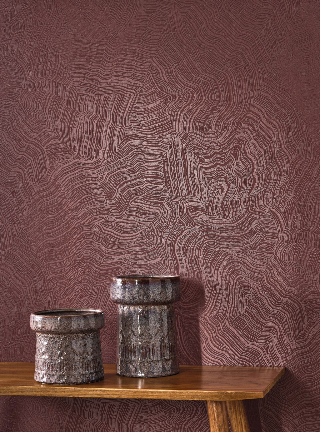 Bordó árnyalatú, topográfiai vonalvezetésű, texturált design tapéta, amely elegáns, modern és természetközeli atmoszférát teremt.