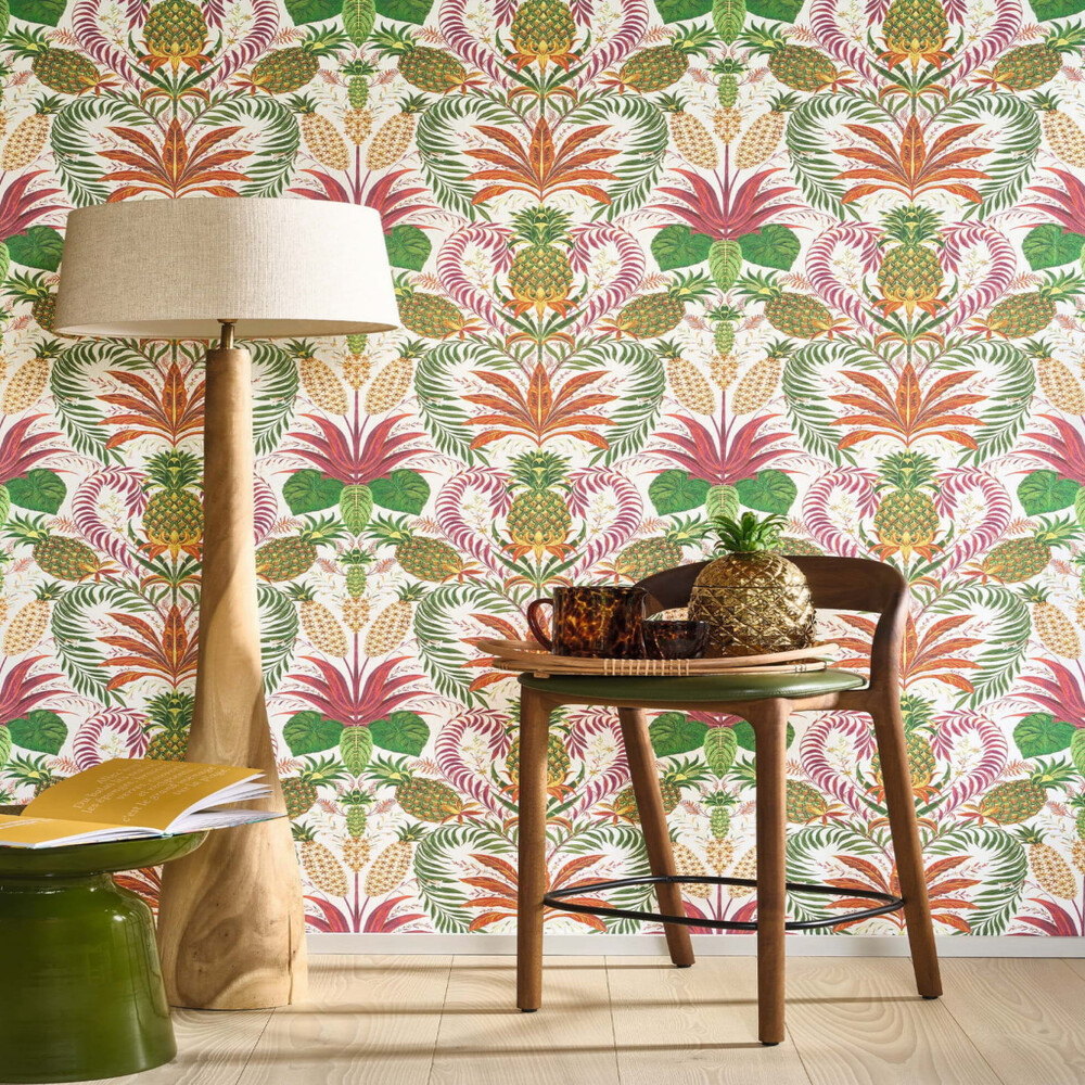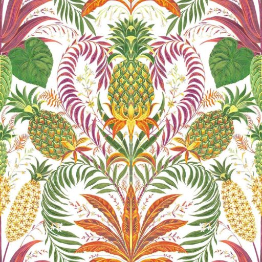 A trópusi ananász mintás tapéta különleges és dekoratív megjelenést biztosít a modern enteriőrökben. A részletgazdag botanikus minták, az ananász motívumok és a stilizált levelek egzotikus hangulatot teremtenek, miközben elegáns és karakteres faldekorációt biztosítanak.