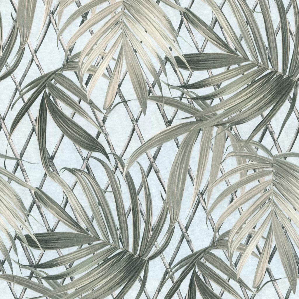 Kék alapú, zöld bambusz- és pálmalevél mintás tapéta, természetes trópusi hangulattal. Ideális nappaliba, hálószobába vagy előszobai hangsúlyfalhoz.
