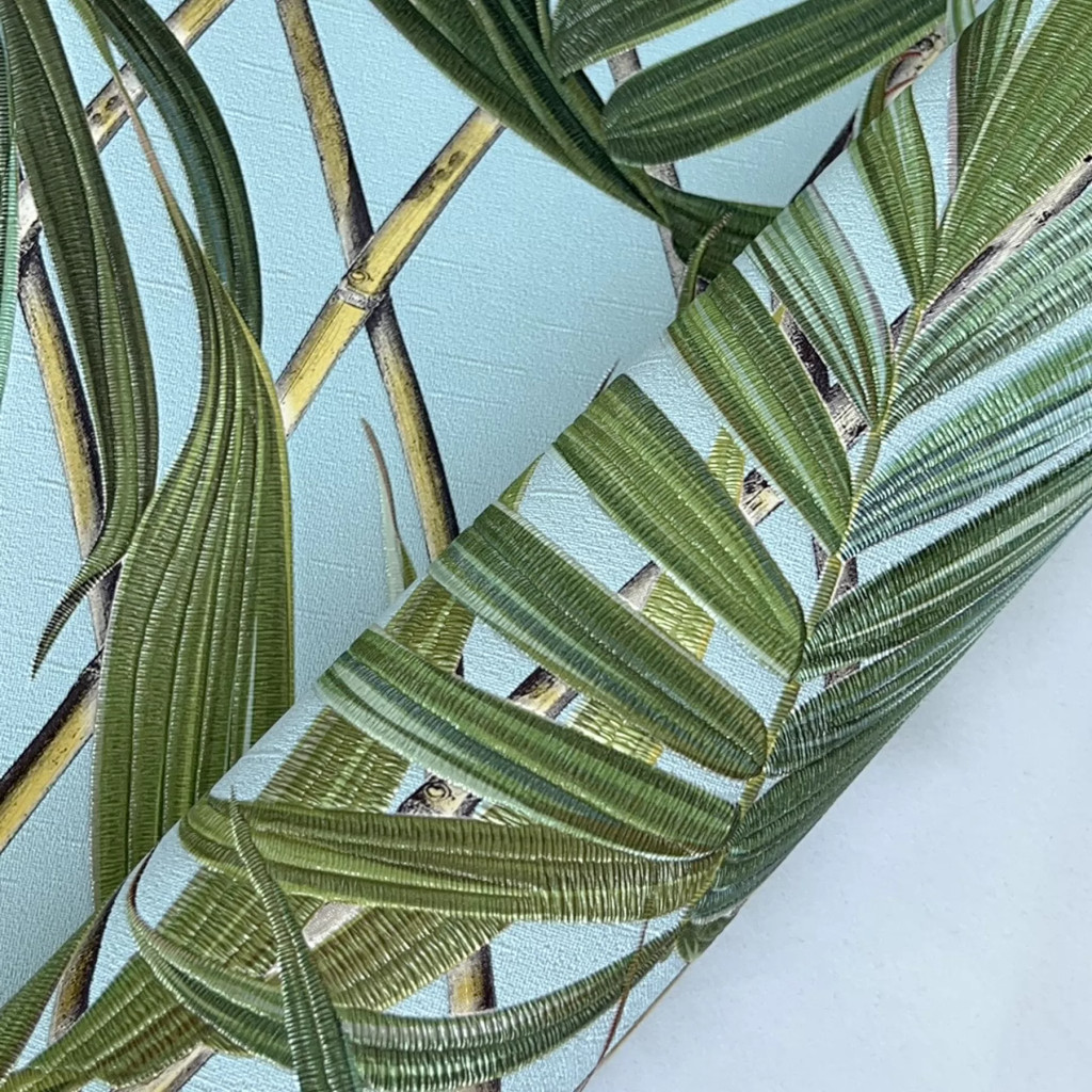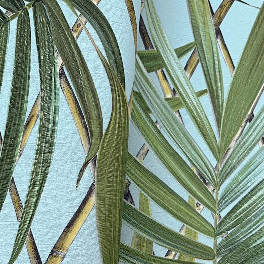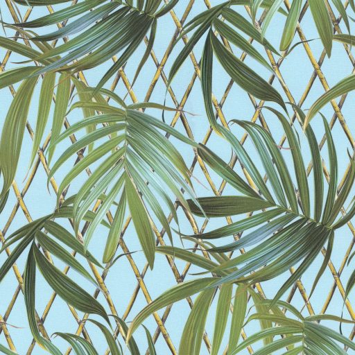 Kék alapú, zöld bambusz- és pálmalevél mintás tapéta, természetes trópusi hangulattal. Ideális nappaliba, hálószobába vagy előszobai hangsúlyfalhoz.