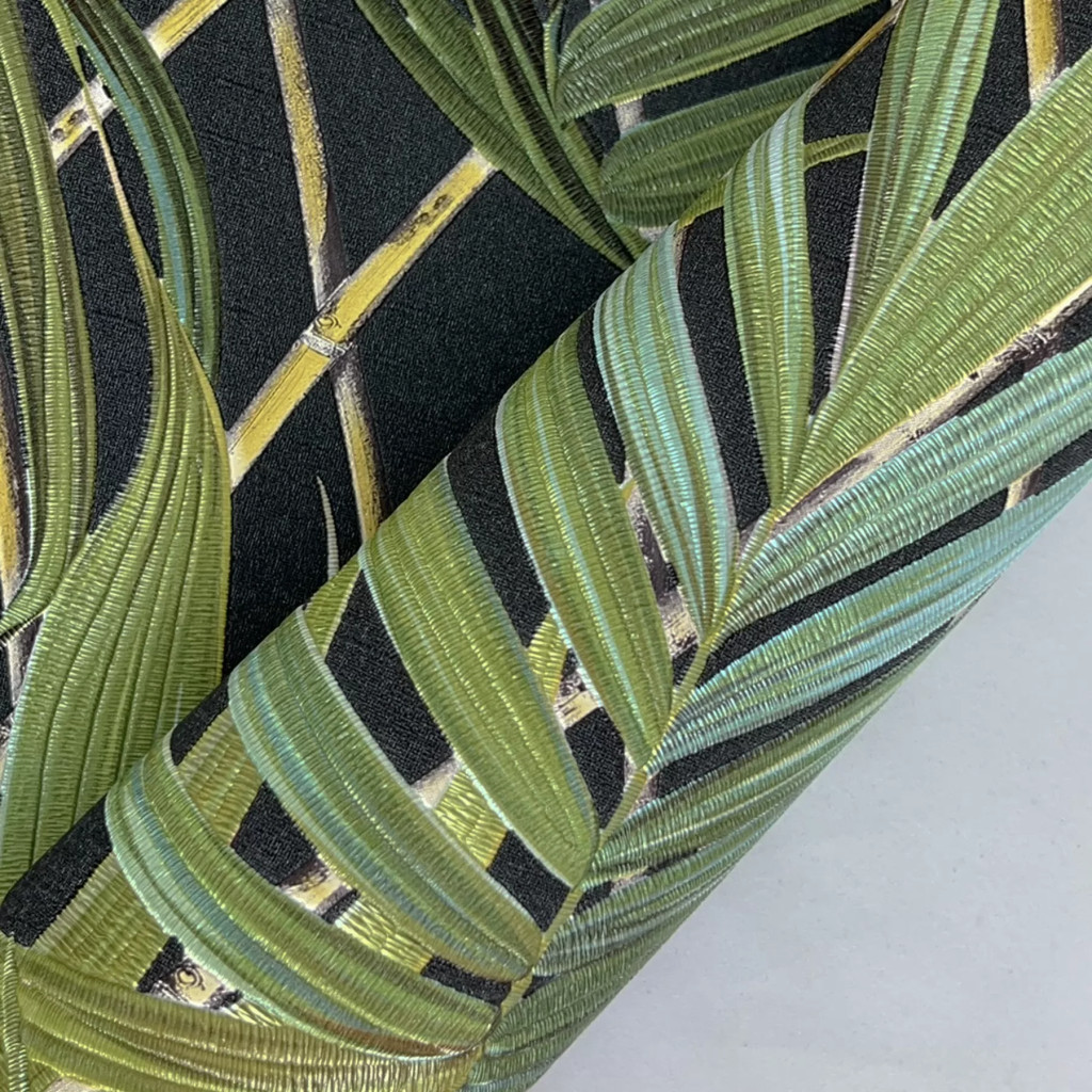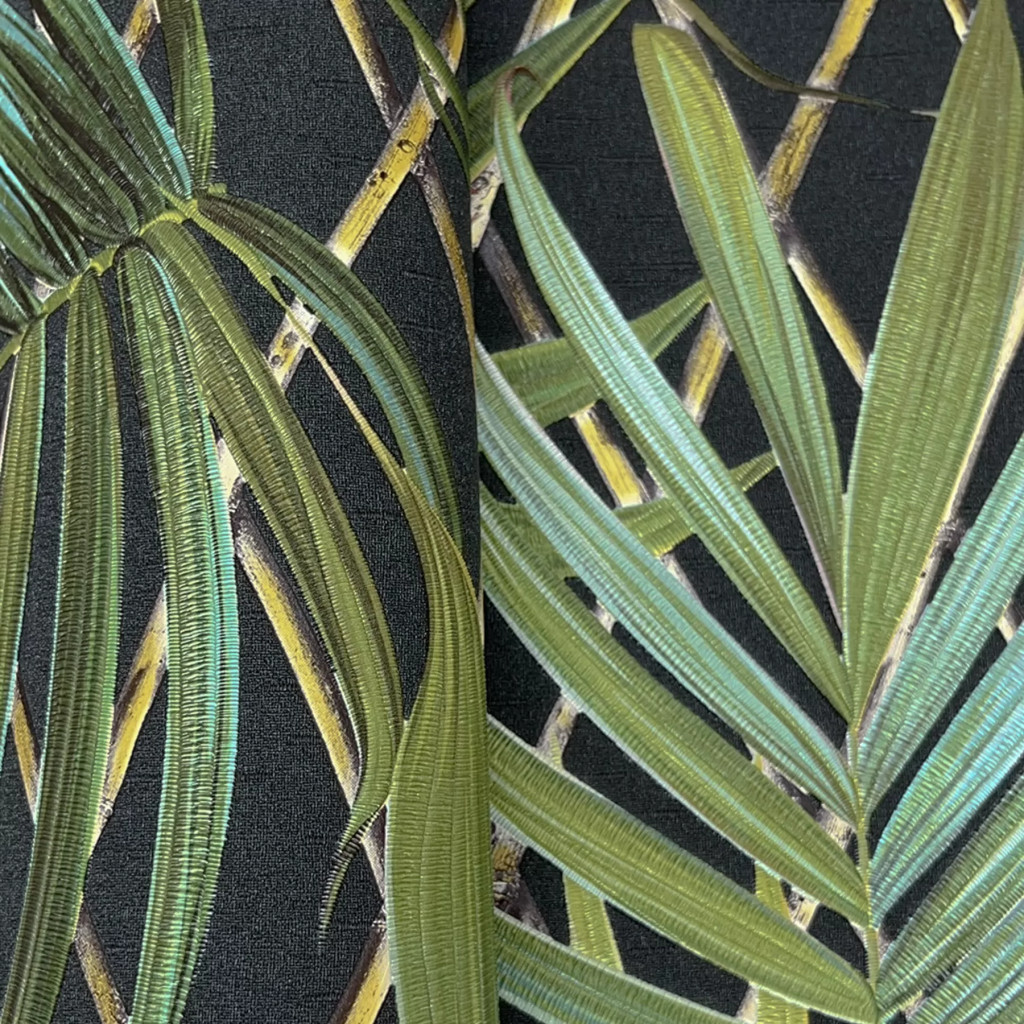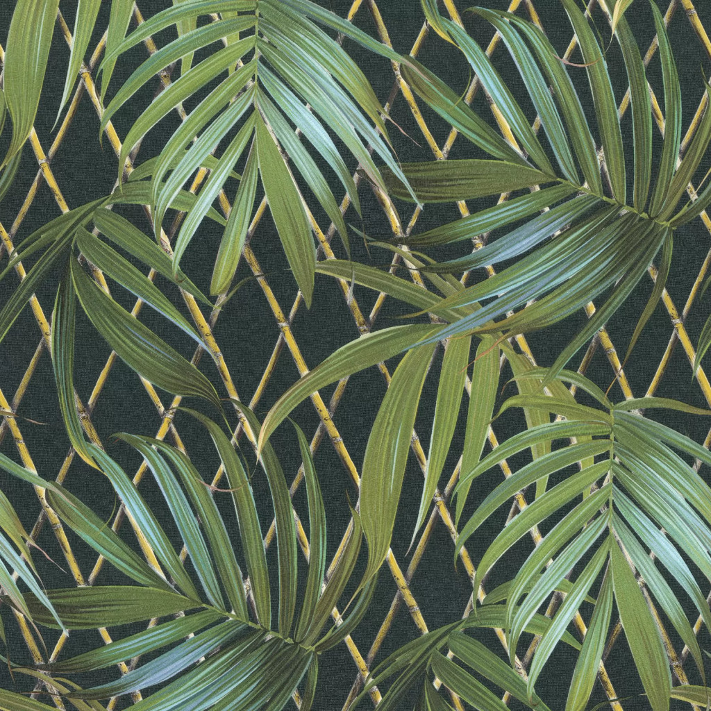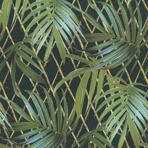 Sötét alapú, zöld bambusz- és pálmalevél mintás tapéta, természetes trópusi hangulattal. Ideális nappaliba, hálószobába vagy előszobai hangsúlyfalhoz.