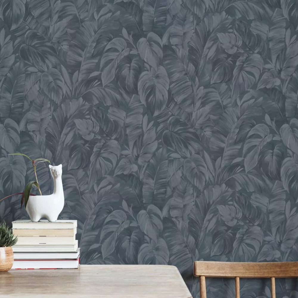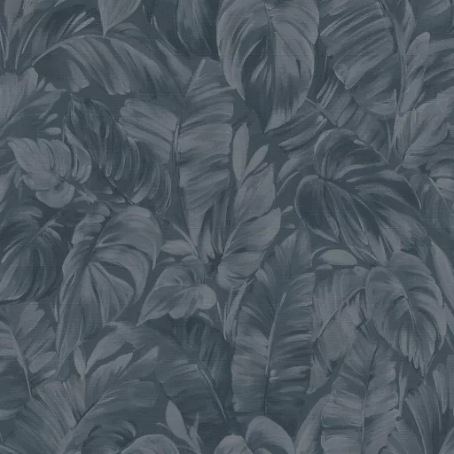 Trópusi levél mintás tapéta kék színben – botanikus, jungle stílusú designer tapéta modern faldekorációhoz