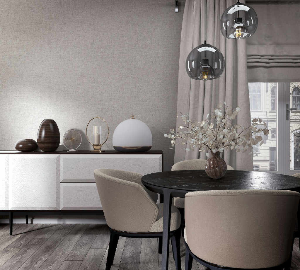 A greige textilhatású tapéta kiválóan kombinálható fa, krém, fehér és fekete bútorokkal, így ideális nappaliba, hálószobába, étkezőbe, valamint exkluzív üzleti vagy hotel enteriőrökbe.