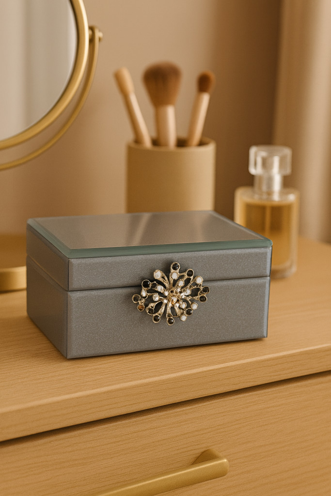Elegáns, üvegből készült díszdoboz csillogó dísszel – praktikus és dekoratív ékszertároló a mindennapi használathoz.