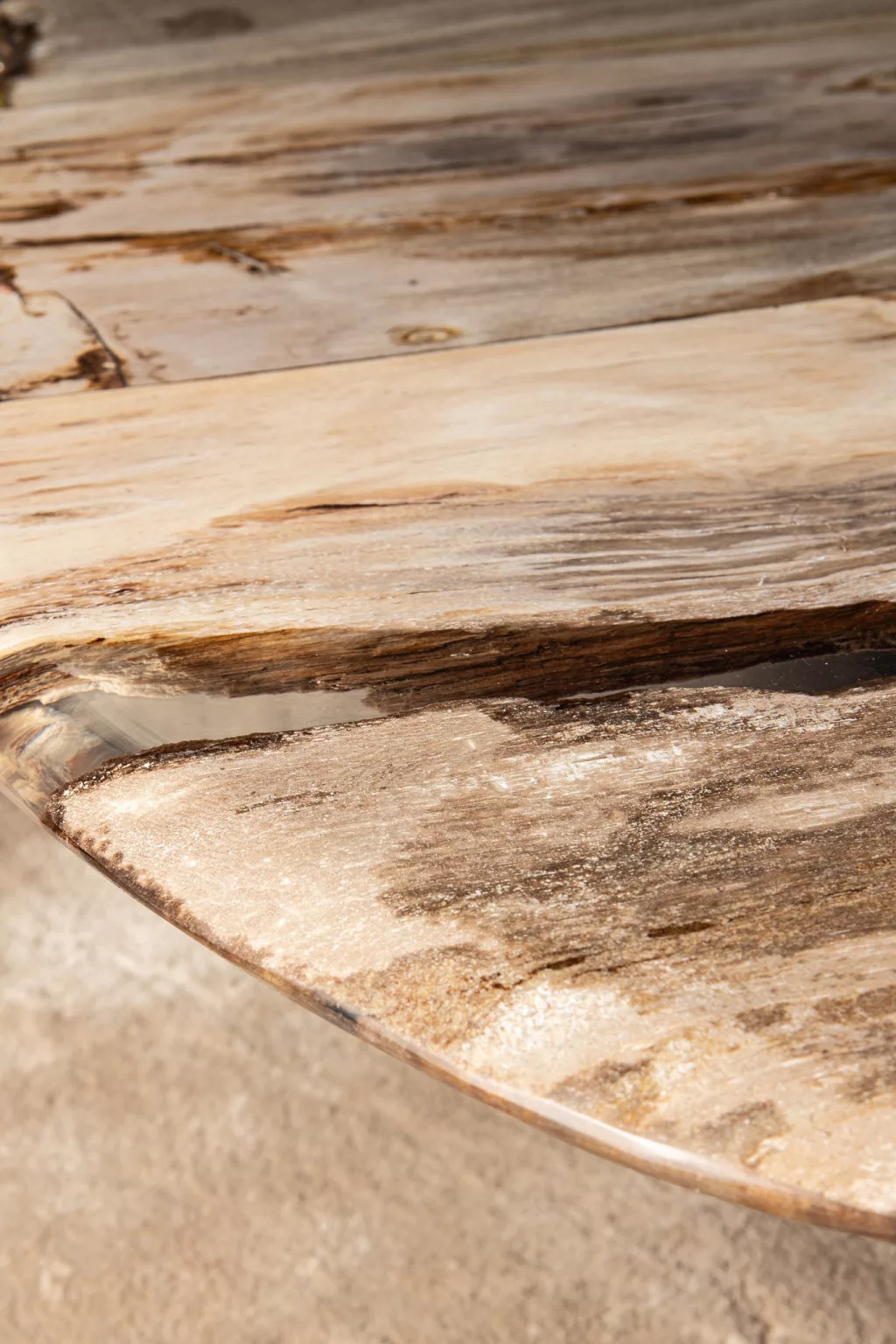 Excusive design asztal megkövesedett fából készült asztallappal valódi statement darab a modern és természetközeli enteriőrökben. Az asztalok egyedi mintázatú, kőhatású felülete a természet erejét és időtállóságát tükrözi, miközben prémium, exkluzív megjelenést biztosít. A masszív kialakítás stabil használatot garantál, a két különböző méretű asztal pedig rugalmasan variálható a térben – együtt vagy külön-külön is látványosak. Ideális választás nappaliba, lounge térbe vagy exkluzív lakásdekorációként.