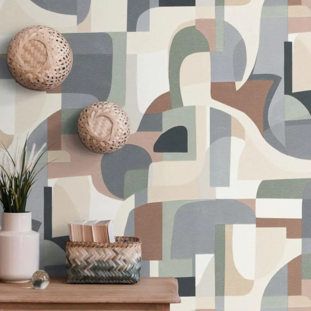 Ez a modern geometrikus mintás tapéta tökéletes választás azok számára, akik egyedi, mégis harmonikus enteriőrt szeretnének kialakítani. Az absztrakt formák és lágy ívek különleges vizuális játékot hoznak létre, miközben a pasztell árnyalatok meleg és otthonos hangulatot biztosítanak.
