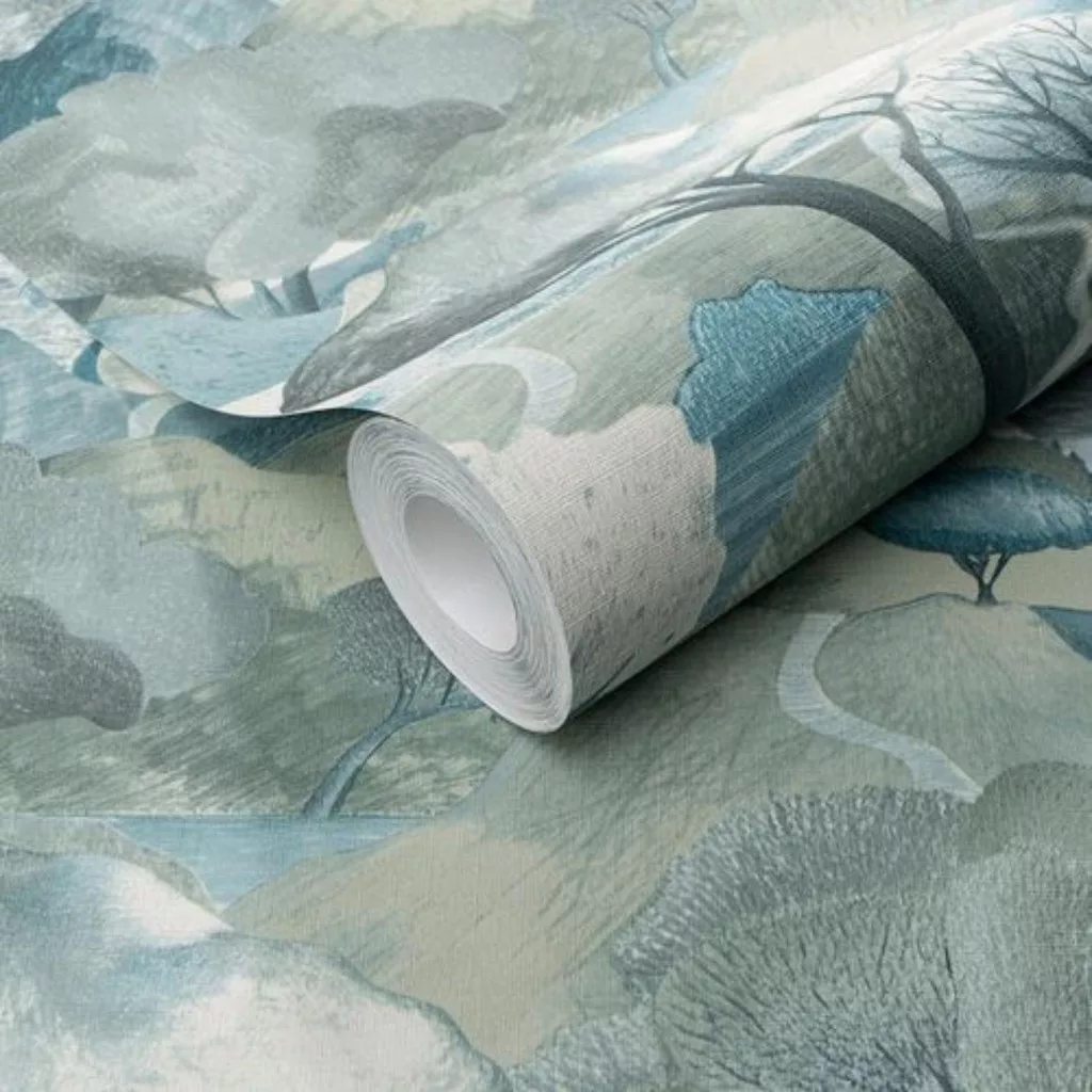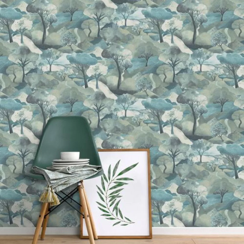 Ez a dekor tapéta egy stilizált, festői tájvilágot jelenít meg, amely egyedi karaktert ad a térnek. A részletgazdag kompozíció és a finoman rétegzett formák különleges mélységet hoznak létre, így a fal nemcsak háttérként, hanem látványos fókuszpontként is működik.