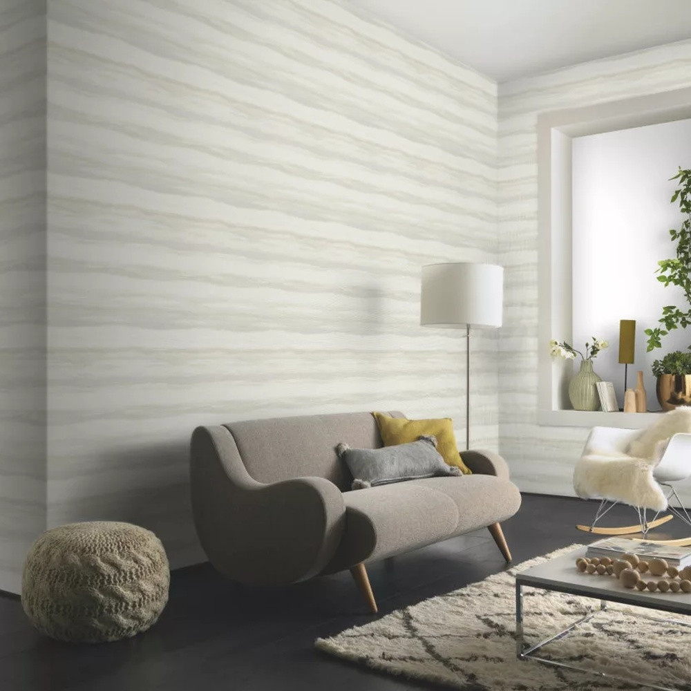 Textúrált akvarell hatású tapéta – vízszintes hullám mintával taupe árnyalat kombinálásával