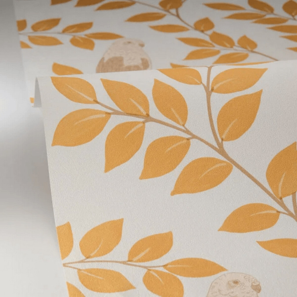 Természet ihlette madaras és levél mintás dekor tapéta, amely harmonikus és nyugodt hangulatot teremt az enteriőrben. Ideális választás nappaliba, hálószobába vagy gyerekszobába